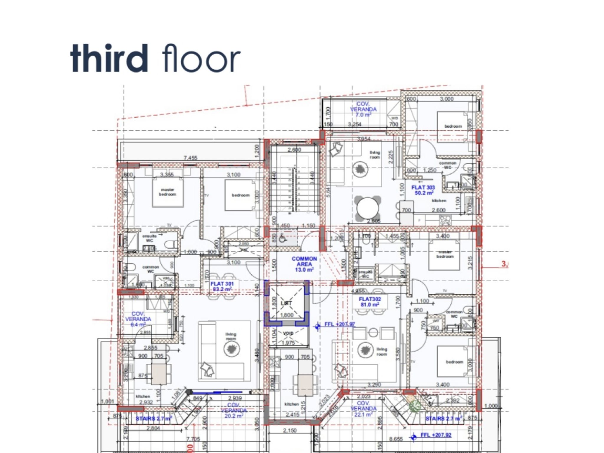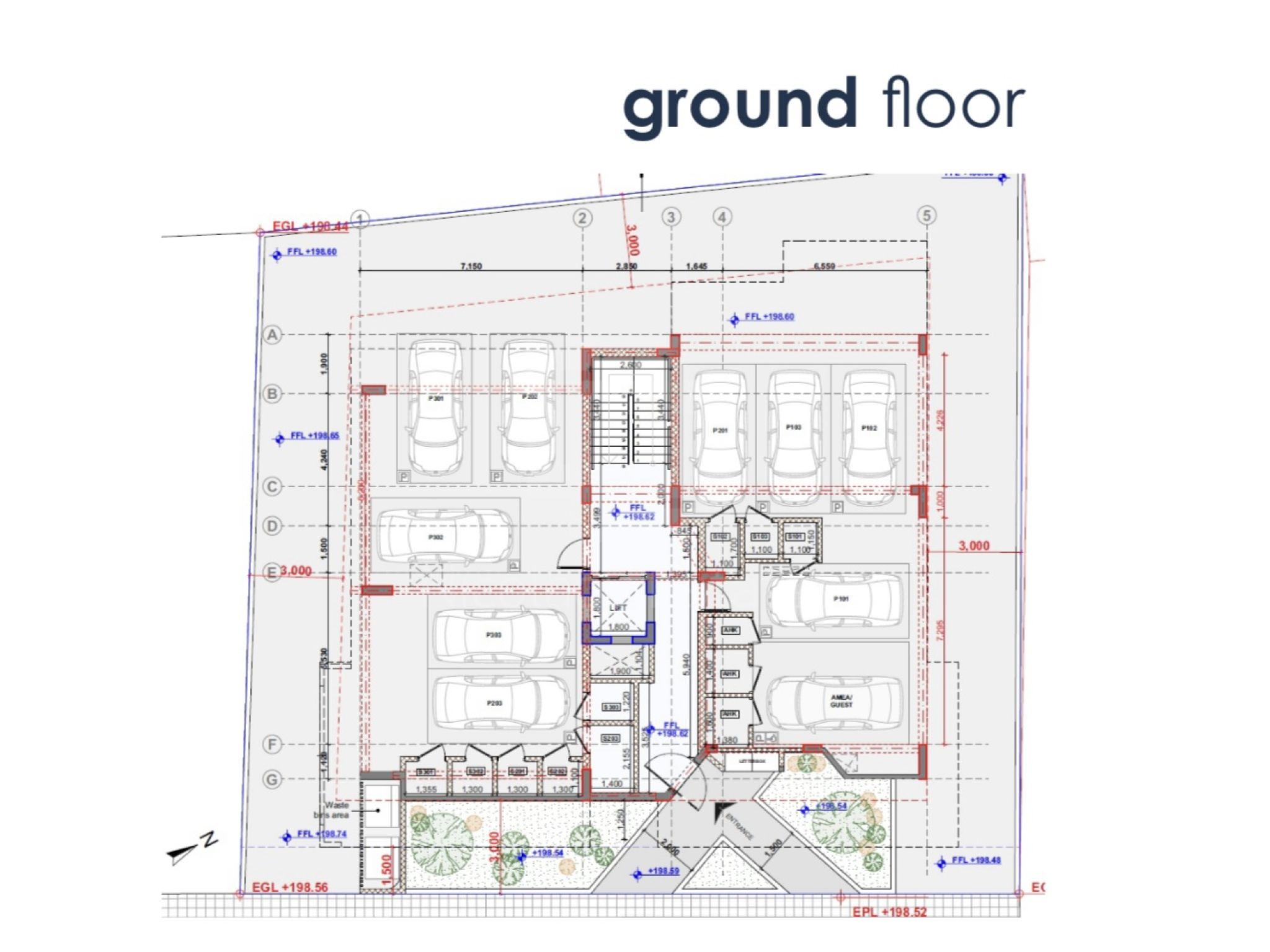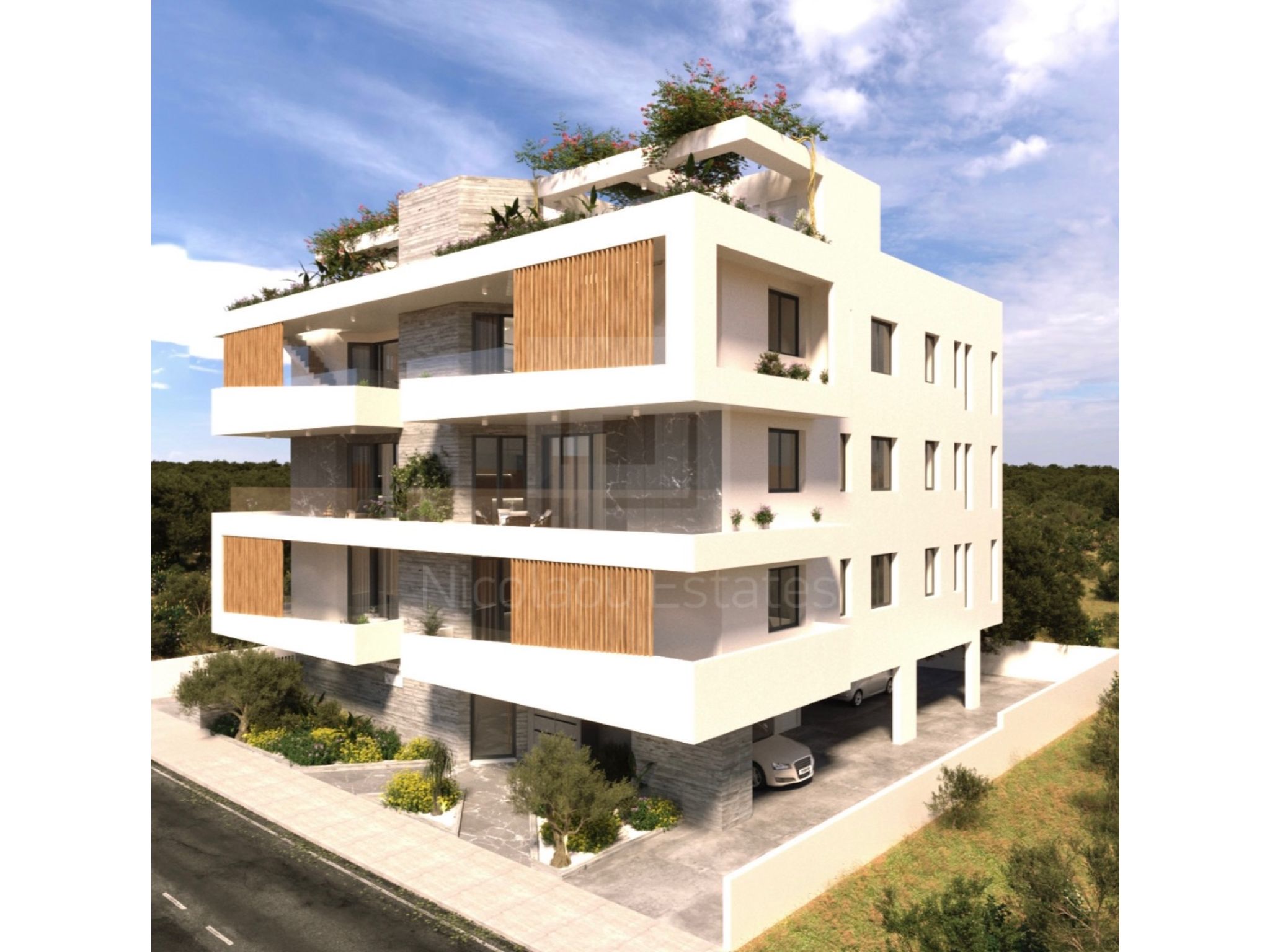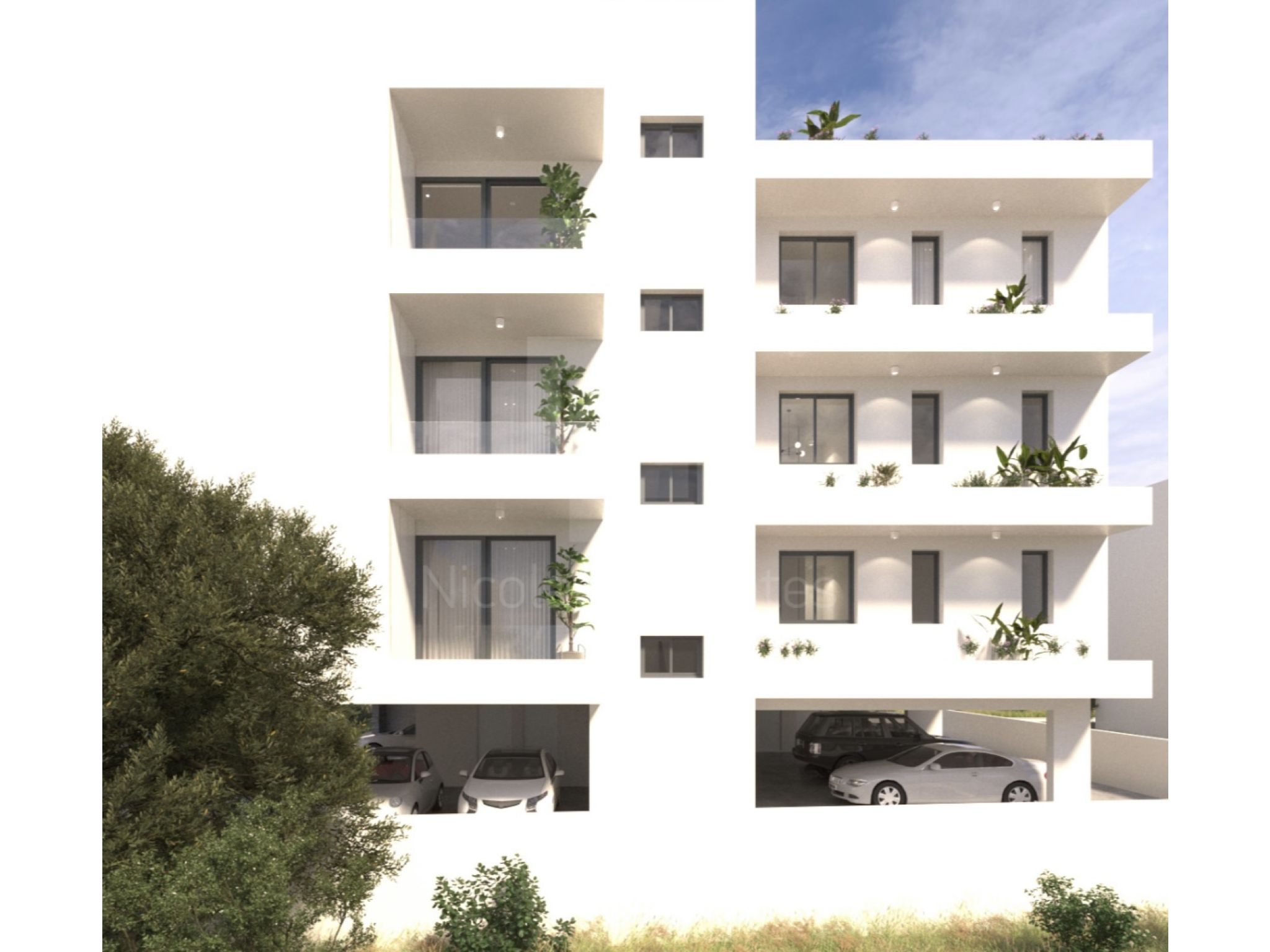 - Ground floor covered parking spaces and storage rooms.