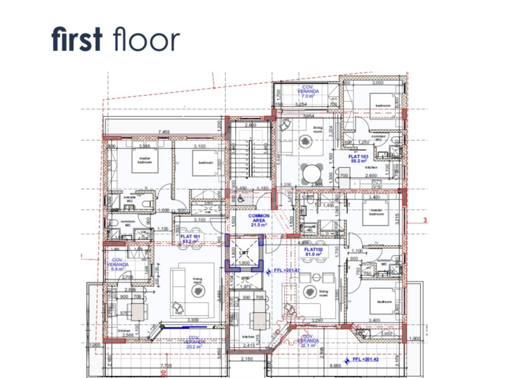 The one-bedroom apartments (103,203,303) have an internal space of 50m2 and a 7m2 balcony. They consist of a large open-plan living-dining room and kitchen, a bathroom and a spacious bedroom. They have private covered parking and storage.