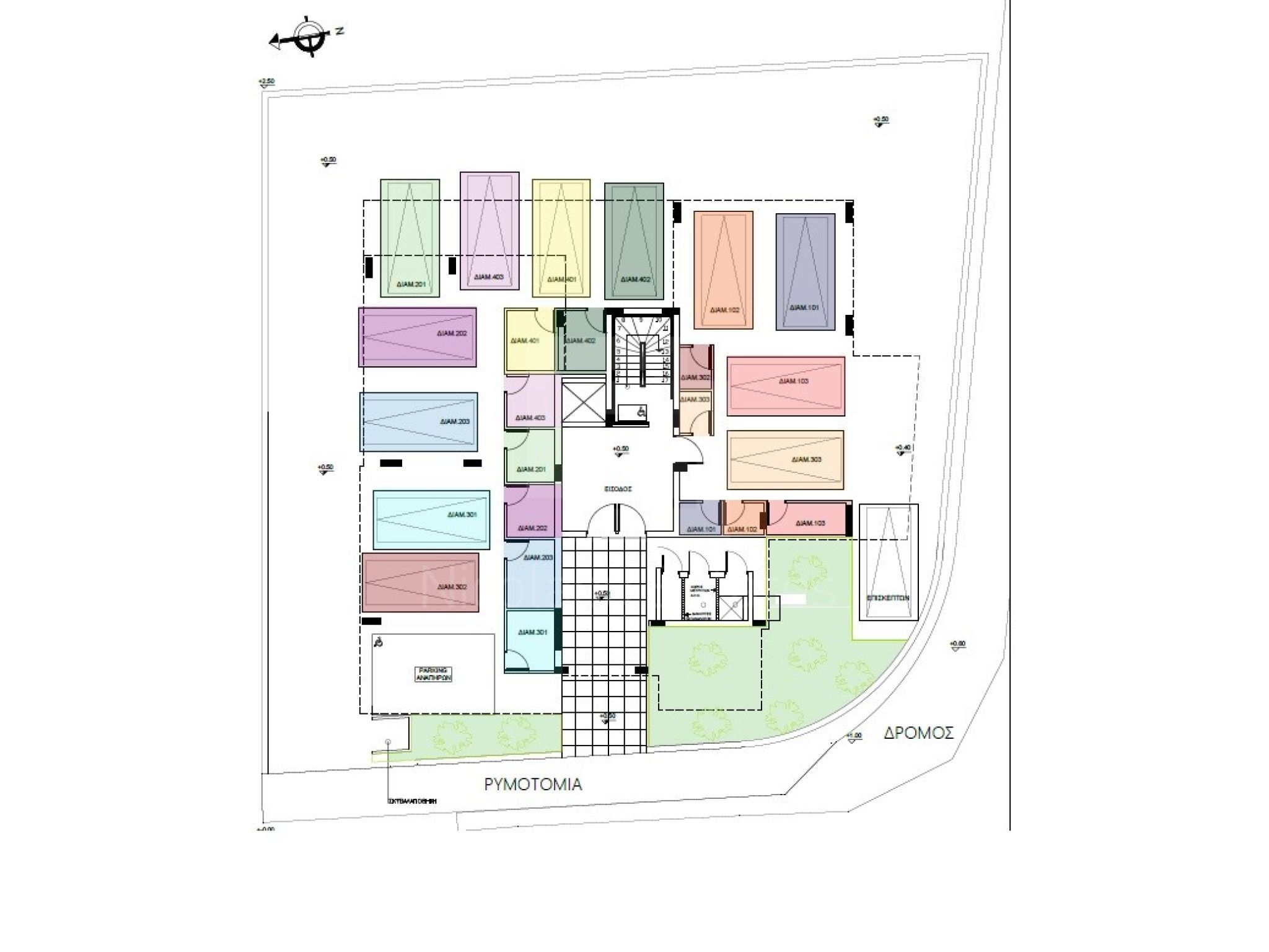Κάθε διαμέρισμα διαθέτει δικό του χώρο στάθμευσης και αποθήκη.