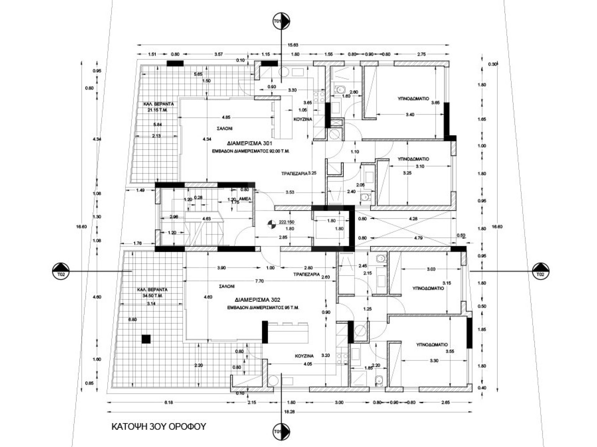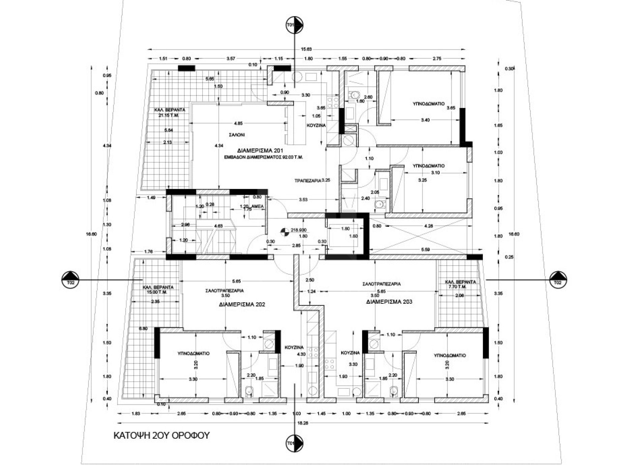 Το τριώροφο κτίριο αποτελείται από οκτώ (8) διαμερίσματα. Τέσσερα (4) από ένα (1) υπνοδωμάτιο και τέσσερα (4) από δύο (2) υπνοδωμάτια.