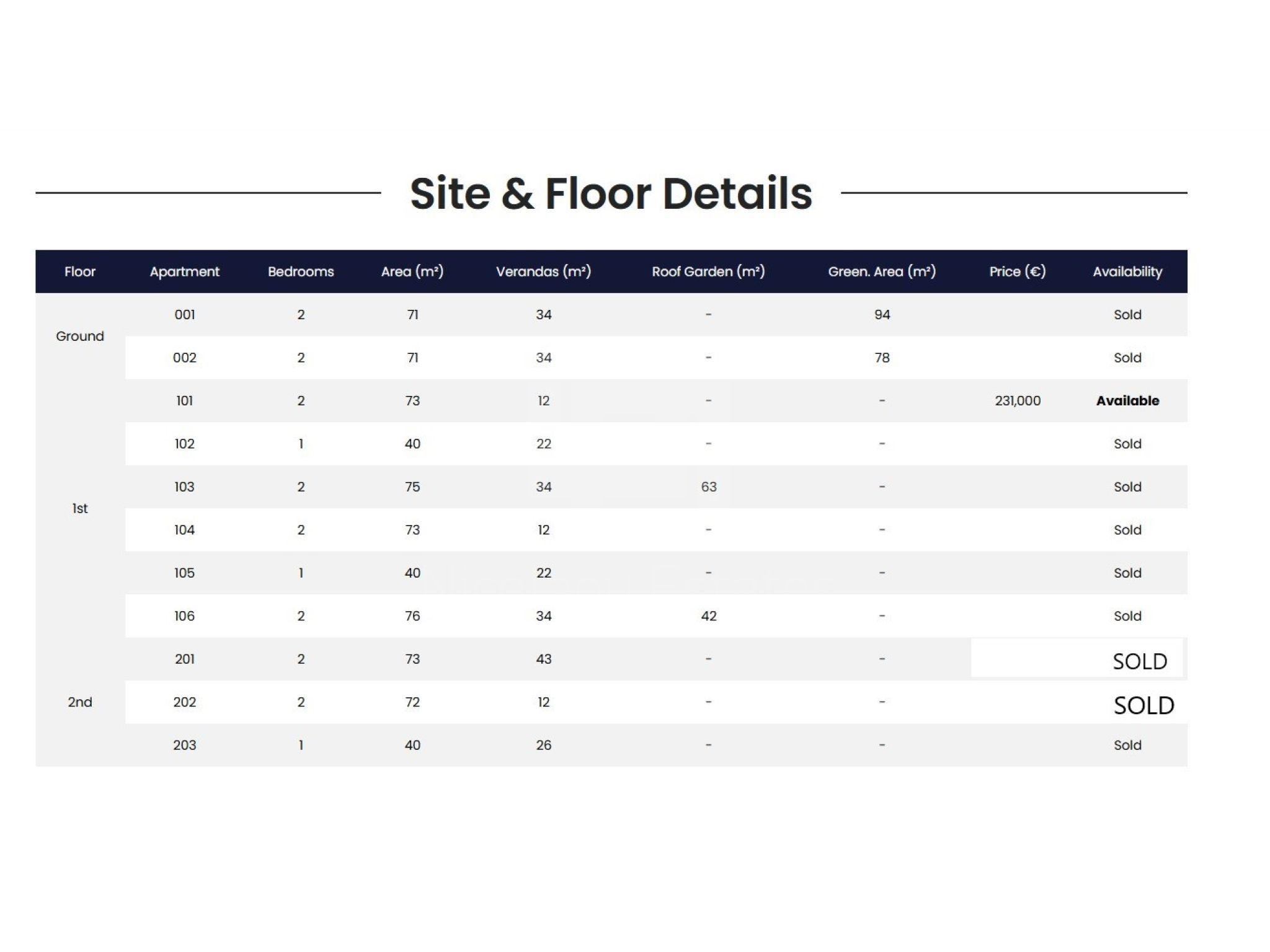 Apt.no.101 is on the 1st floor and it comes with 2 bedrooms, master bedroom with en-suite, 73sq.m internal covered areas plus 12sq.m verandas, Price 231,000 plus VAT
