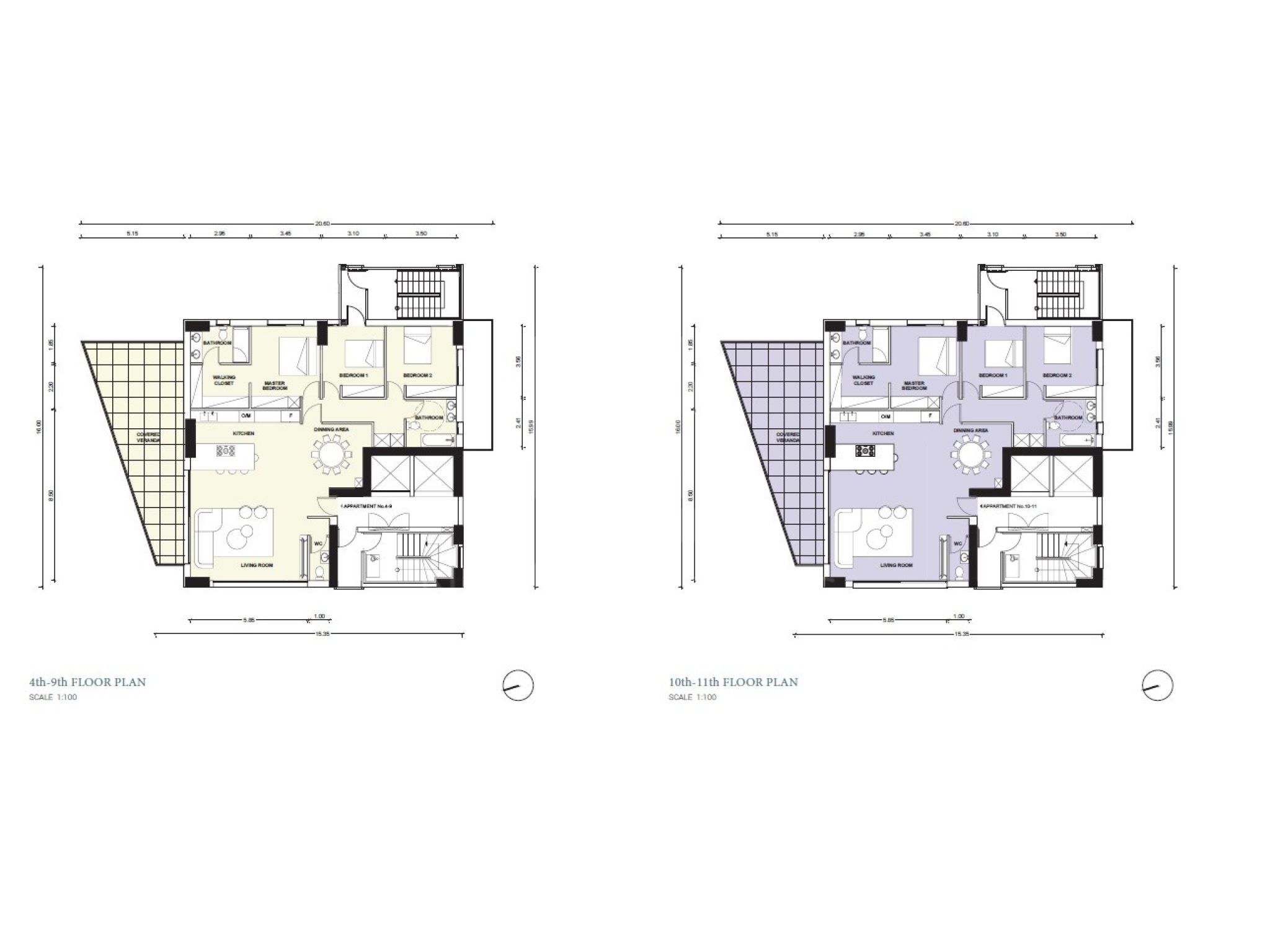 The floors between the 1st and 11th offer sophisticated apartments with a layout that includes spacious bedrooms, a master bedroom with an ensuite bathroom and a walk-in closet, a modern kitchen, a living room, a dining area, and a guest bathroom.
