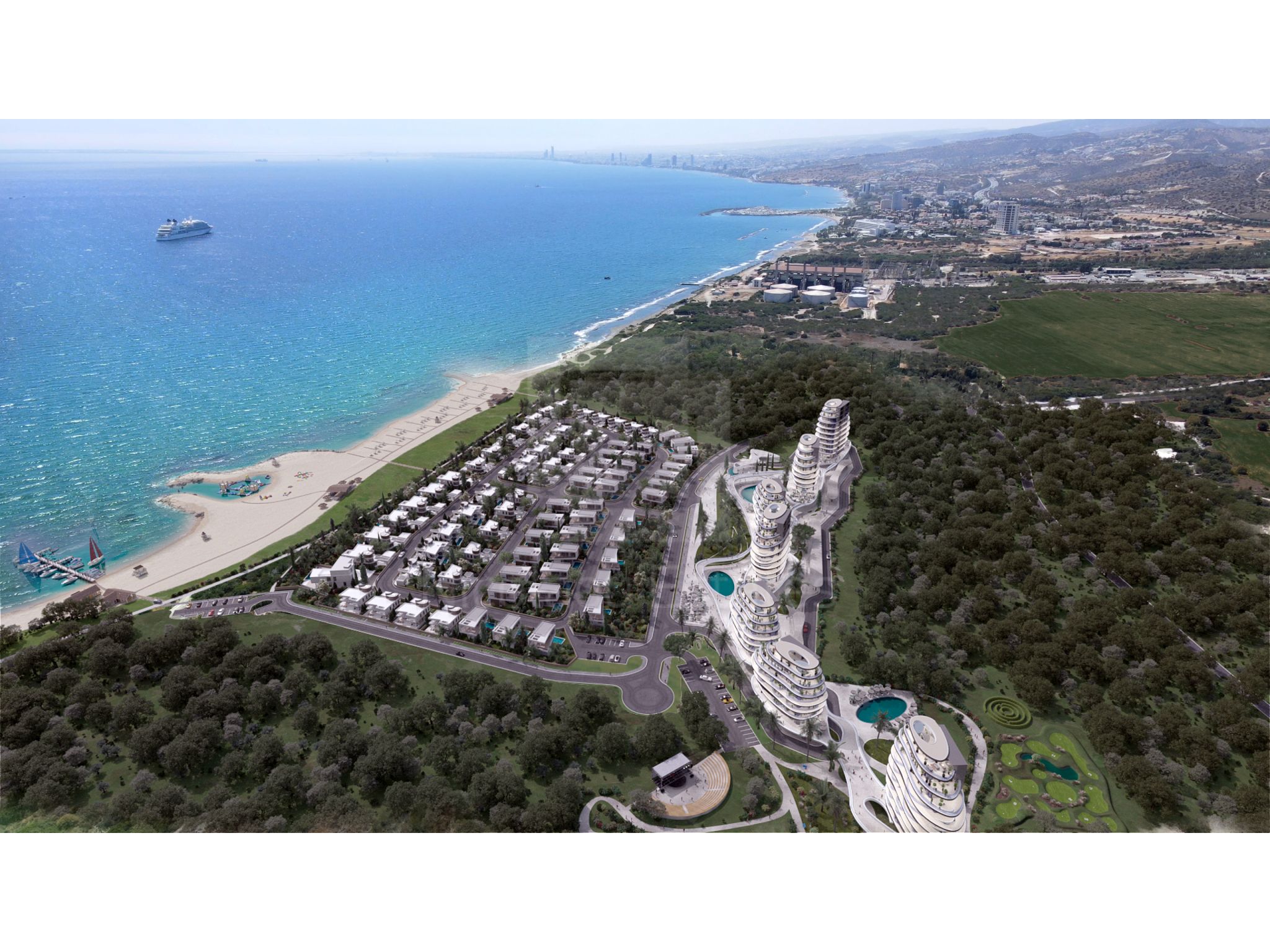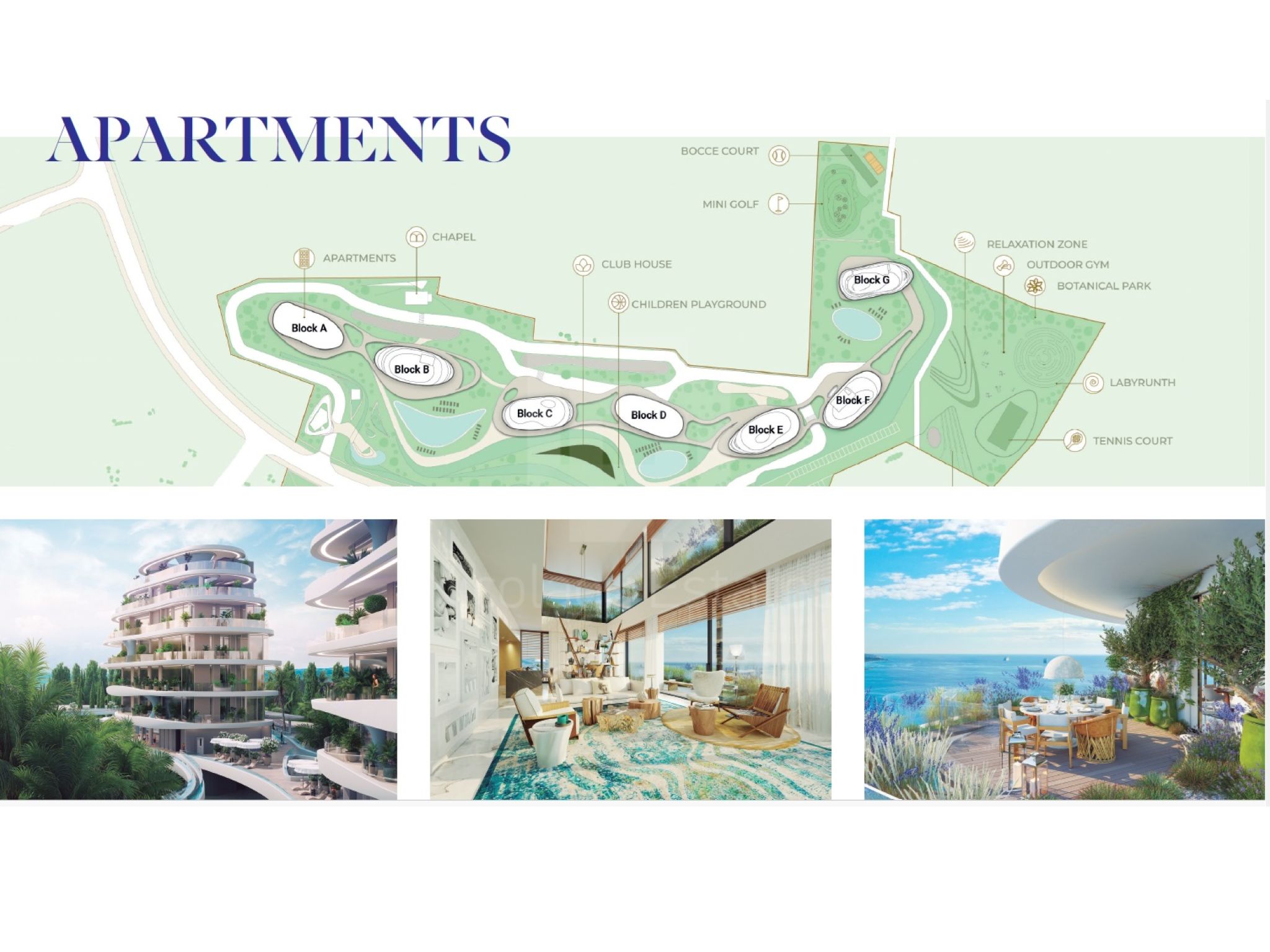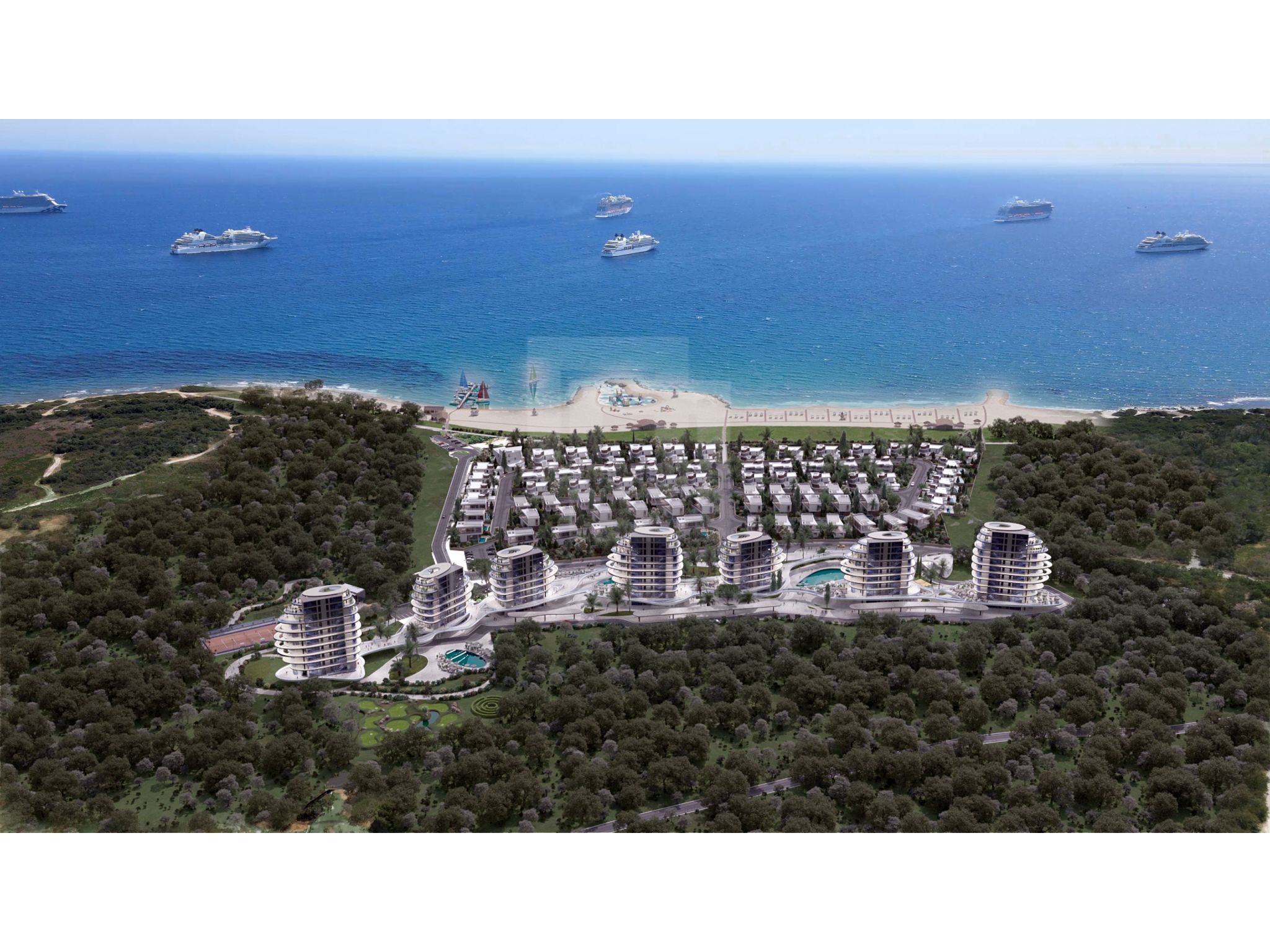 On the territory of the residential complex there are also gyms, a botanical park, a tennis court, a chapel, a center for water sports at sea, an amphitheater.