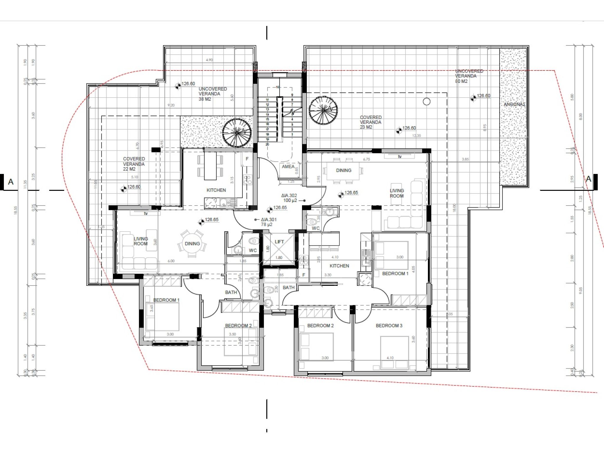 Penthouse apartment no. 301 comes with 2 bedrooms, a bathroom and a guest w.c., a covered parking space & private storage room, 78sq.m of net internal covered areas, massive 44.5sq.m covered verandas plus another 36sq.m of uncovered veranda on the 3rd floor. There’s also the private roof garden with 20sq.m covered area including another bathroom plus another 12.6sq.m of uncovered area.