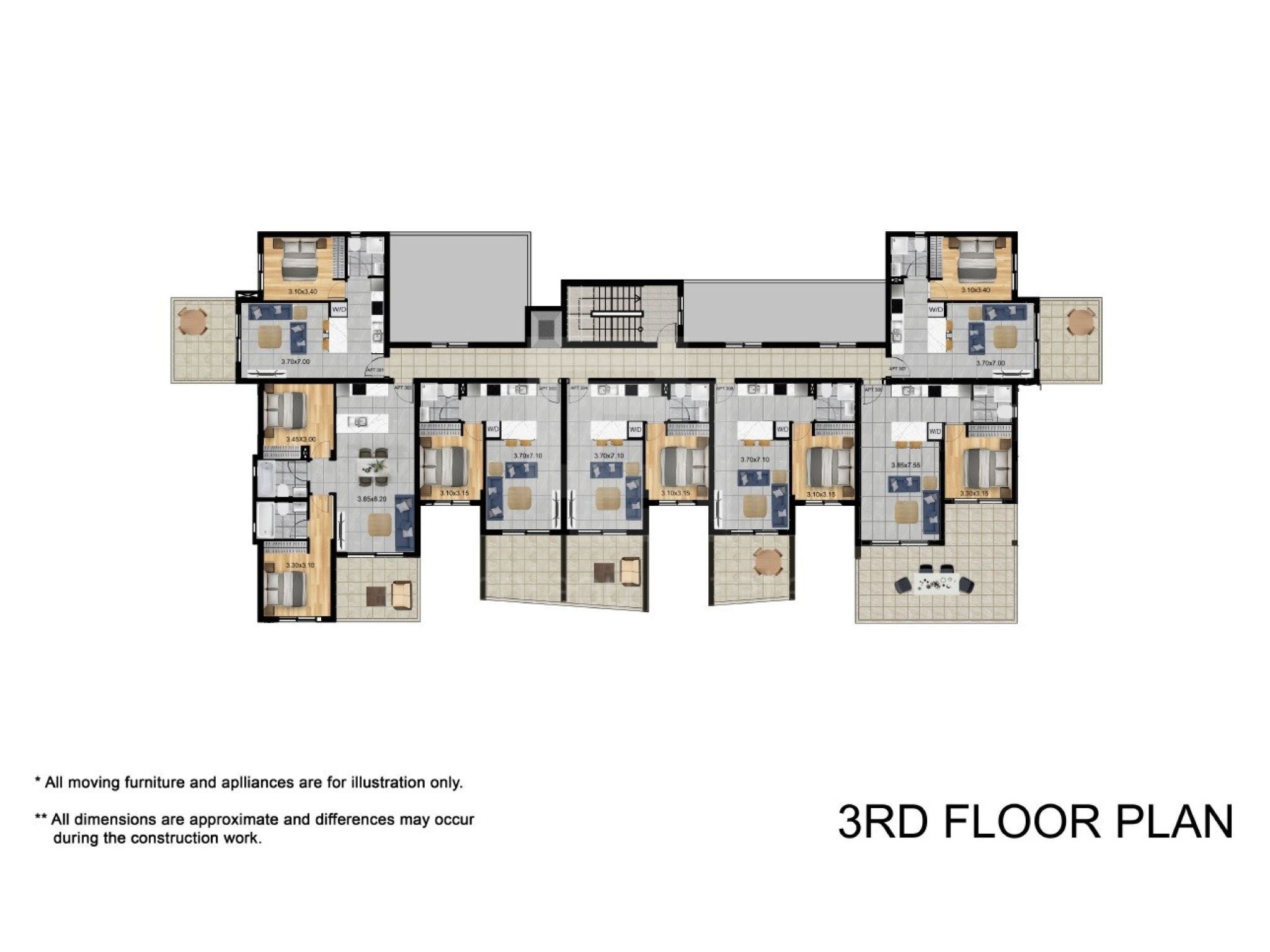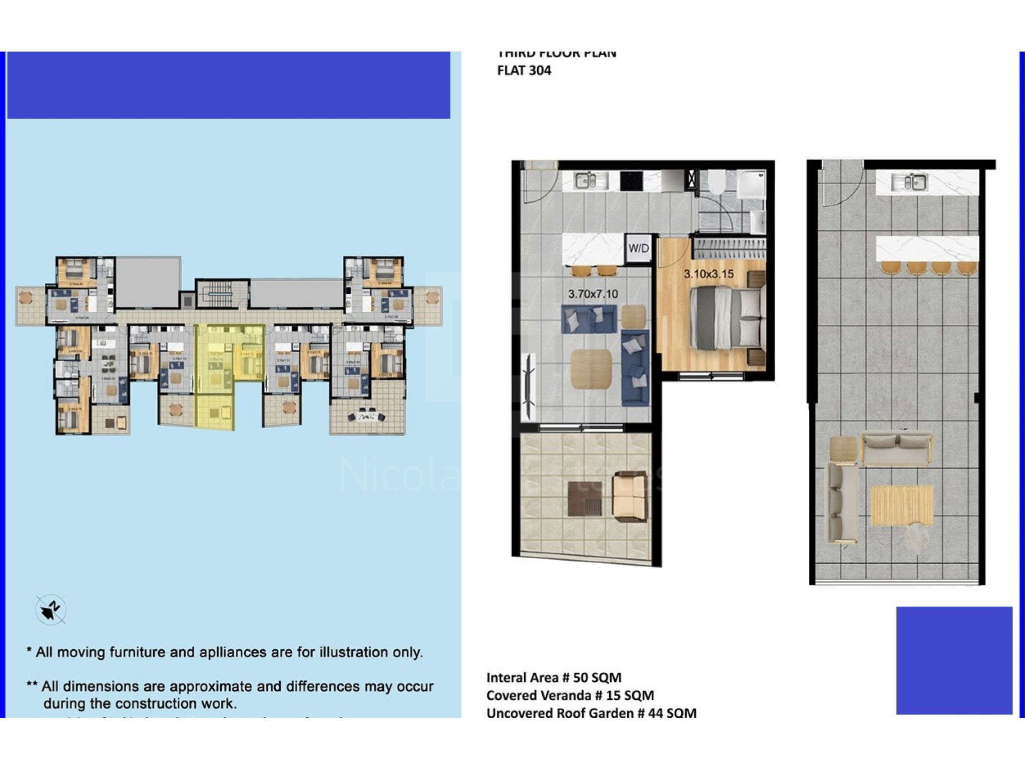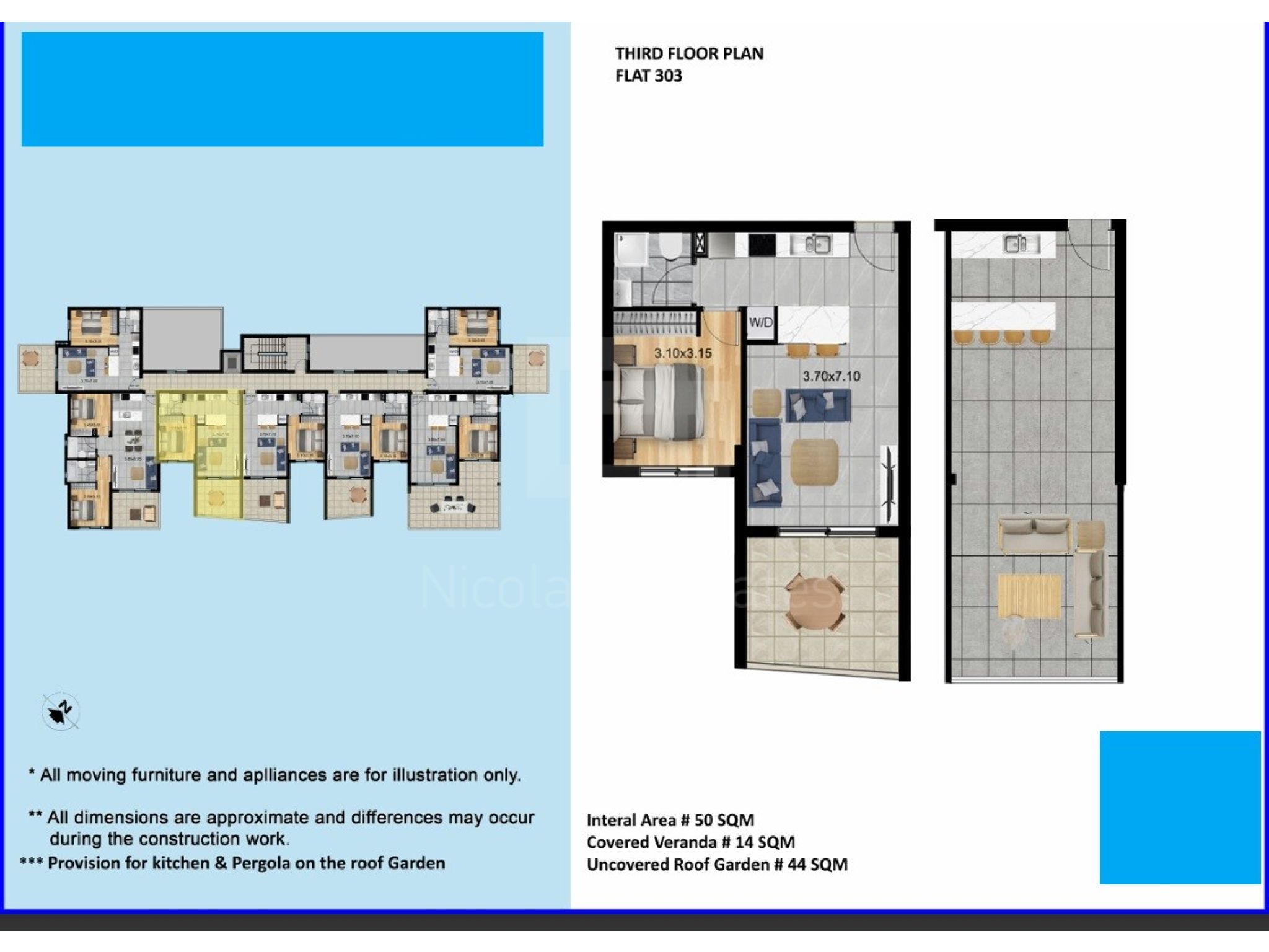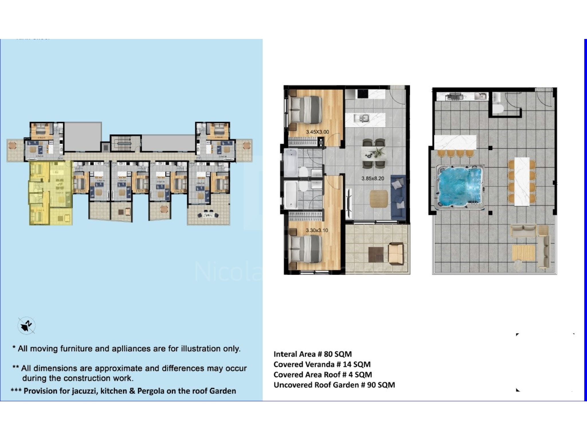 This is a possible combination of the original apartments 302, 303 & 304 with a total covered internal area of 180sq.m, covered verandas of 43sq.m and a huge 188sq.m of private Roof Garden with a W.C and provisions for a jacuzzi, pergola, BBQ and kitchen. There are also 3 private storage rooms and 3 covered parking spaces.