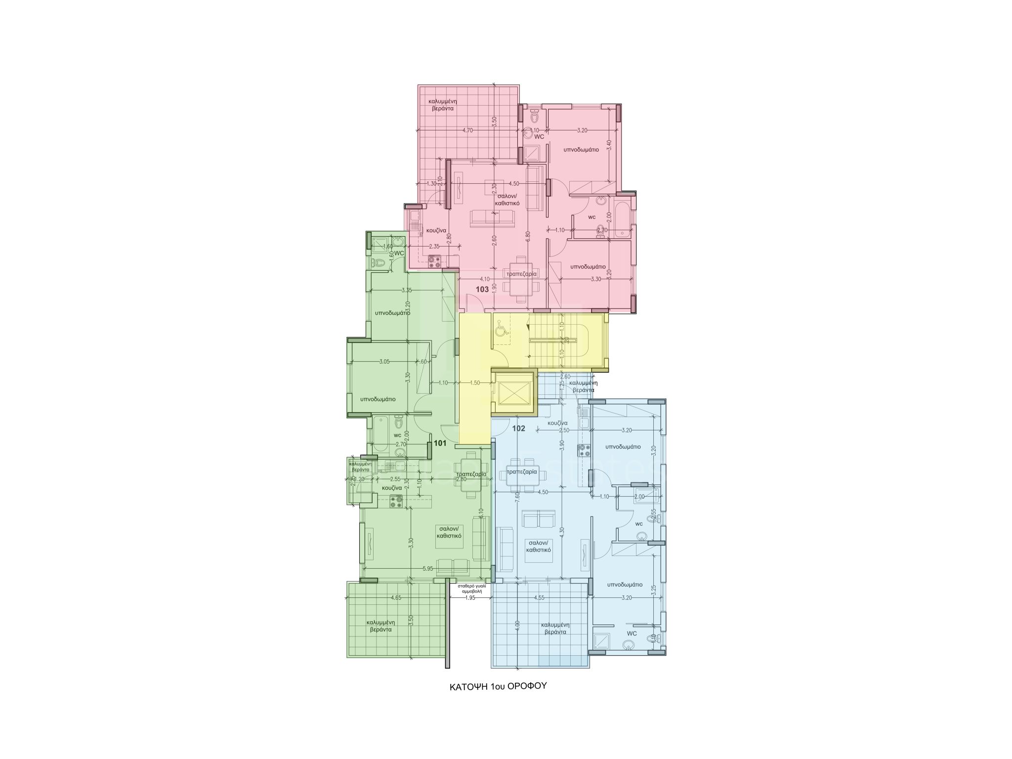 Διαμέρισμα 101 (189.000 συν ΦΠΑ): 122τμ συνολικό εμβαδόν, 83τμ εσωτερικός χώρος, 20τμ καλυμμένη βεράντα, 15τμ καλυμμένο χώρο στάθμευσης και 4τμ αποθήκη.