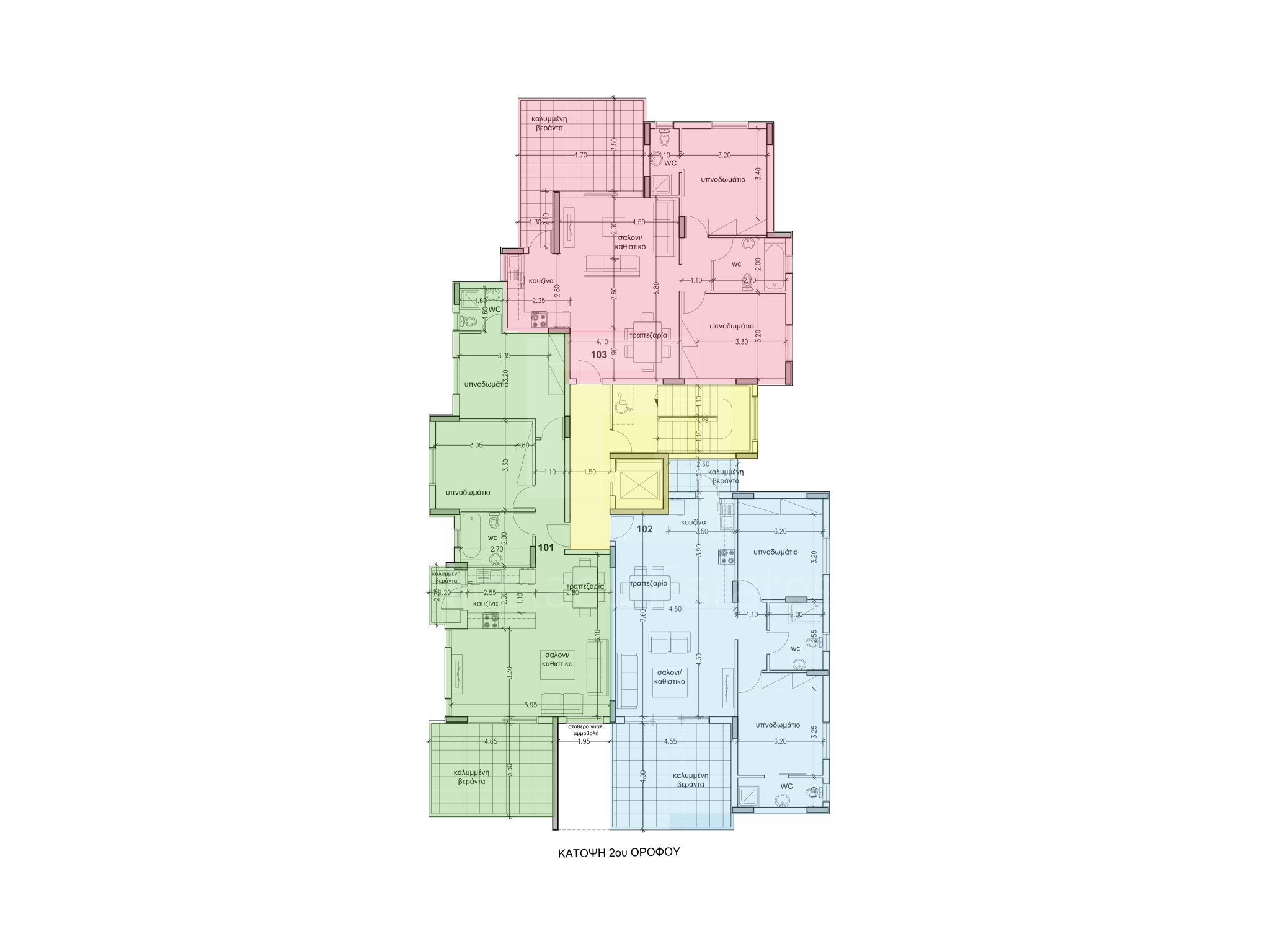 Διαμέρισμα 103 (189.000 συν ΦΠΑ): 119τμ συνολικό εμβαδόν, 82τμ εσωτερικός χώρος, 19τμ καλυμμένη βεράντα, 15τμ καλυμμένο χώρο στάθμευσης και 3τμ αποθήκη.