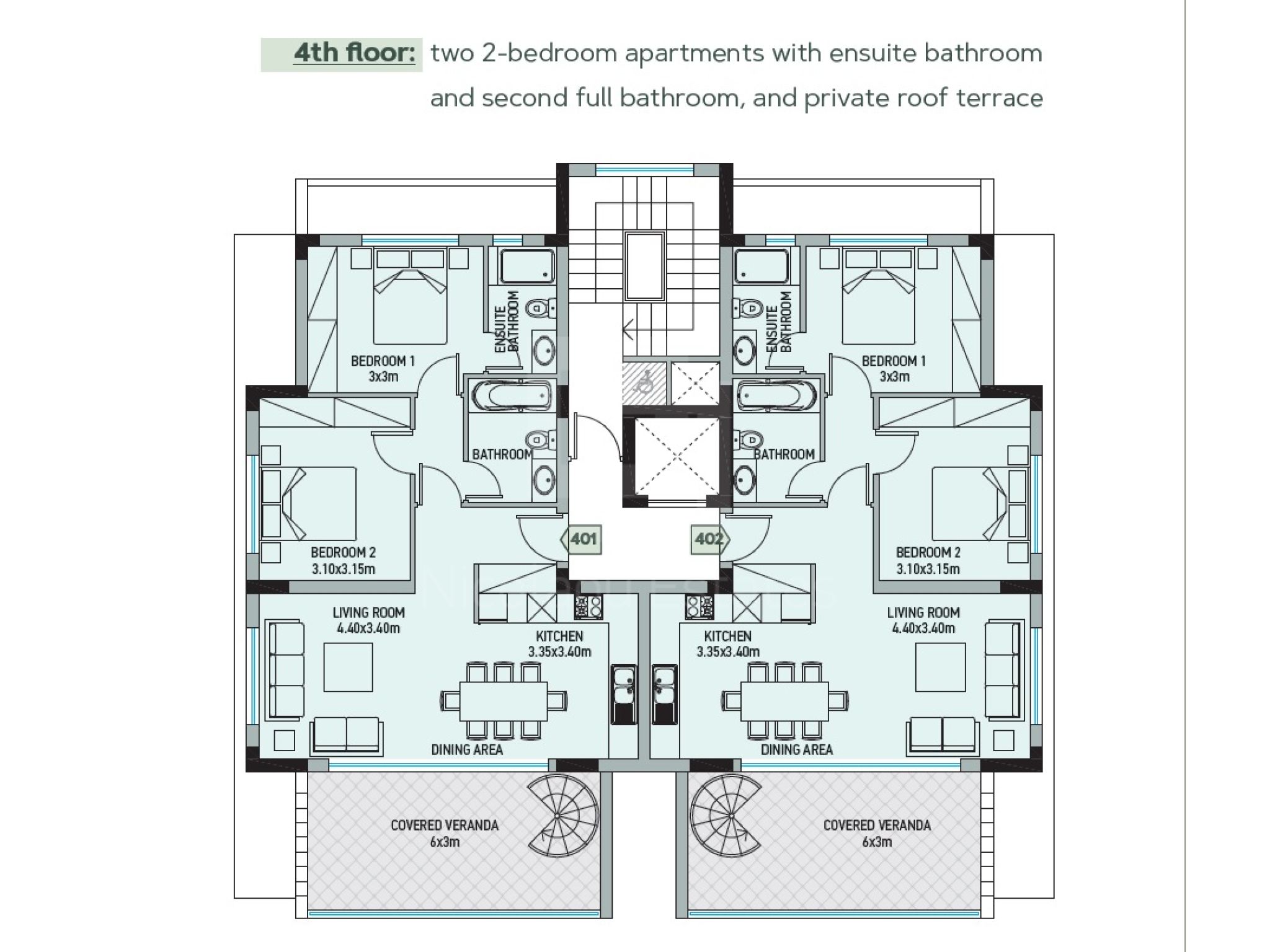 Penthouse Apartments no. 401 & 402 are similar and they come with 81sq.m internal covered areas, 26sq.m of covered verandas on the 4th floor plus another 35sq.m of a private Roof Garden which benefits from a toilet and washing facilities. 2 bedrooms, 2 full bathrooms, open plan kitchen/living areas. Private storage room and designated covered parking space.