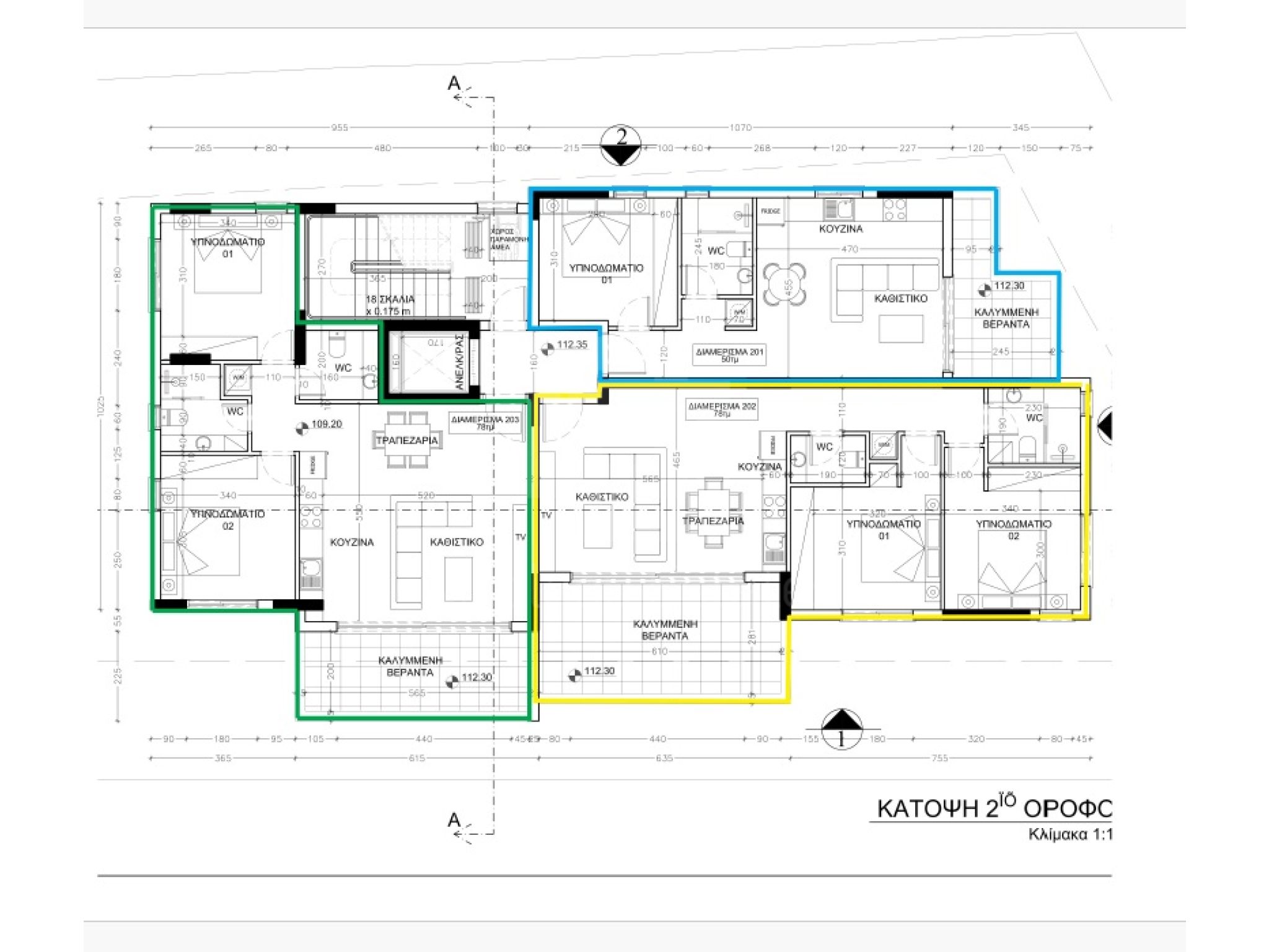 Flat no. 203 comes with two bedrooms, two bathrooms, 78m2 of internal covered area and 14m2 of covered veranda with sea views. Price 290000 euro plus VAT