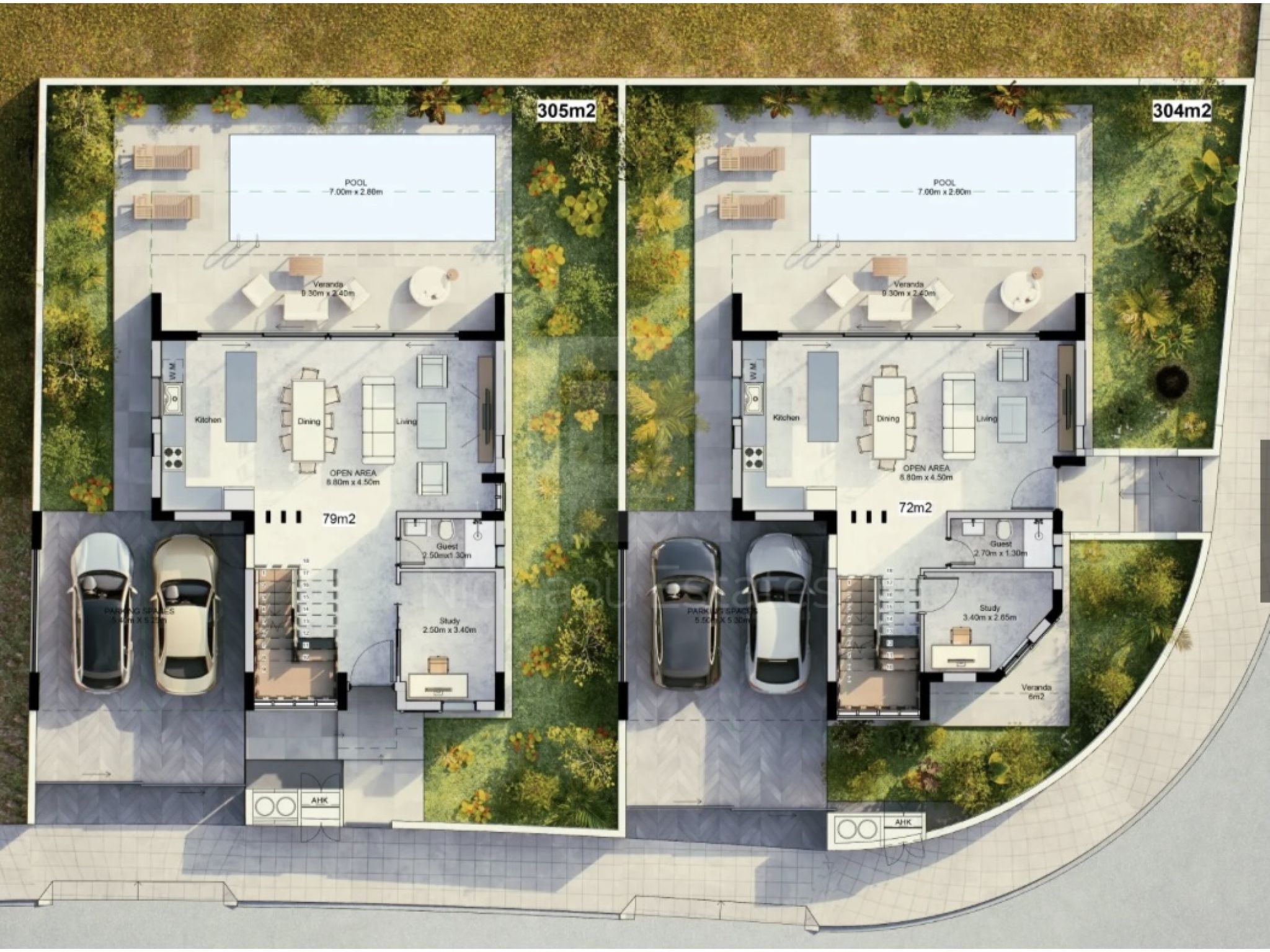 Κατοικία 1 (490.000 συν ΦΠΑ): 305τμ οικόπεδο, 161τμ εσωτερικός χώρος, 30τμ καλυμμένη βεράντα, 18τμ ακάλυπτη βεράντα, 28τμ καλυμμένος χώρος στάθμευσης και ιδιωτική πισίνα.