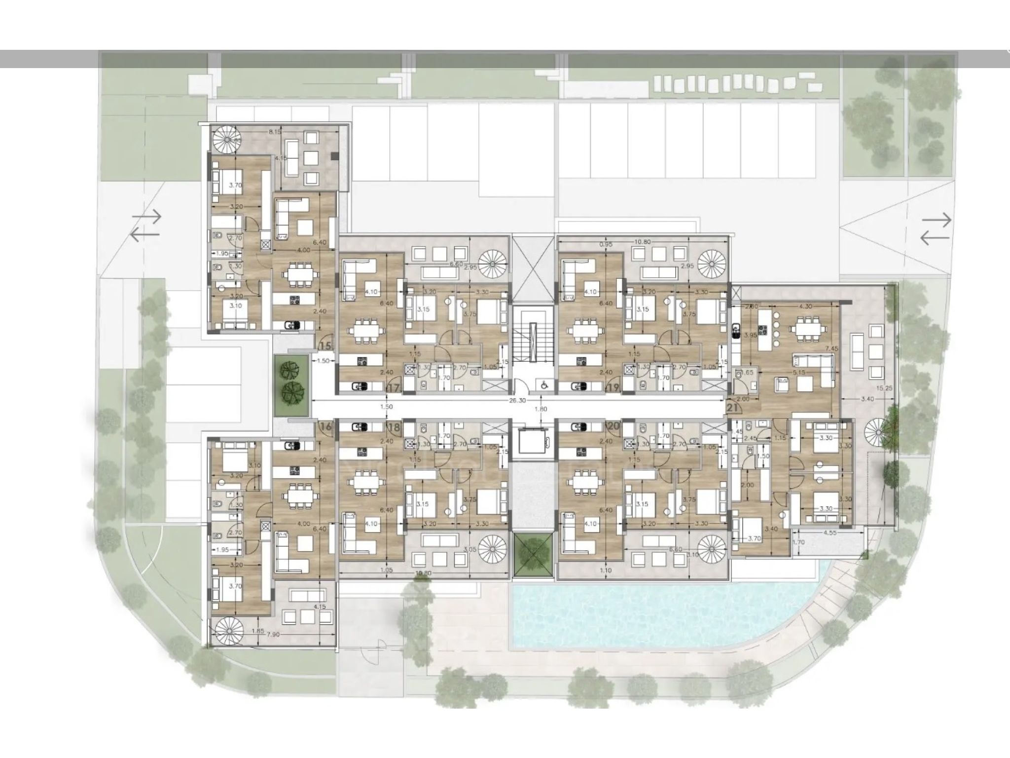 Apt.no. 17, 3rd floor, 87sq.m internal covered areas, 21sq.m covered verandas plus a private roof garden of 43sq.m, 2 bedrooms, 2 bathrooms