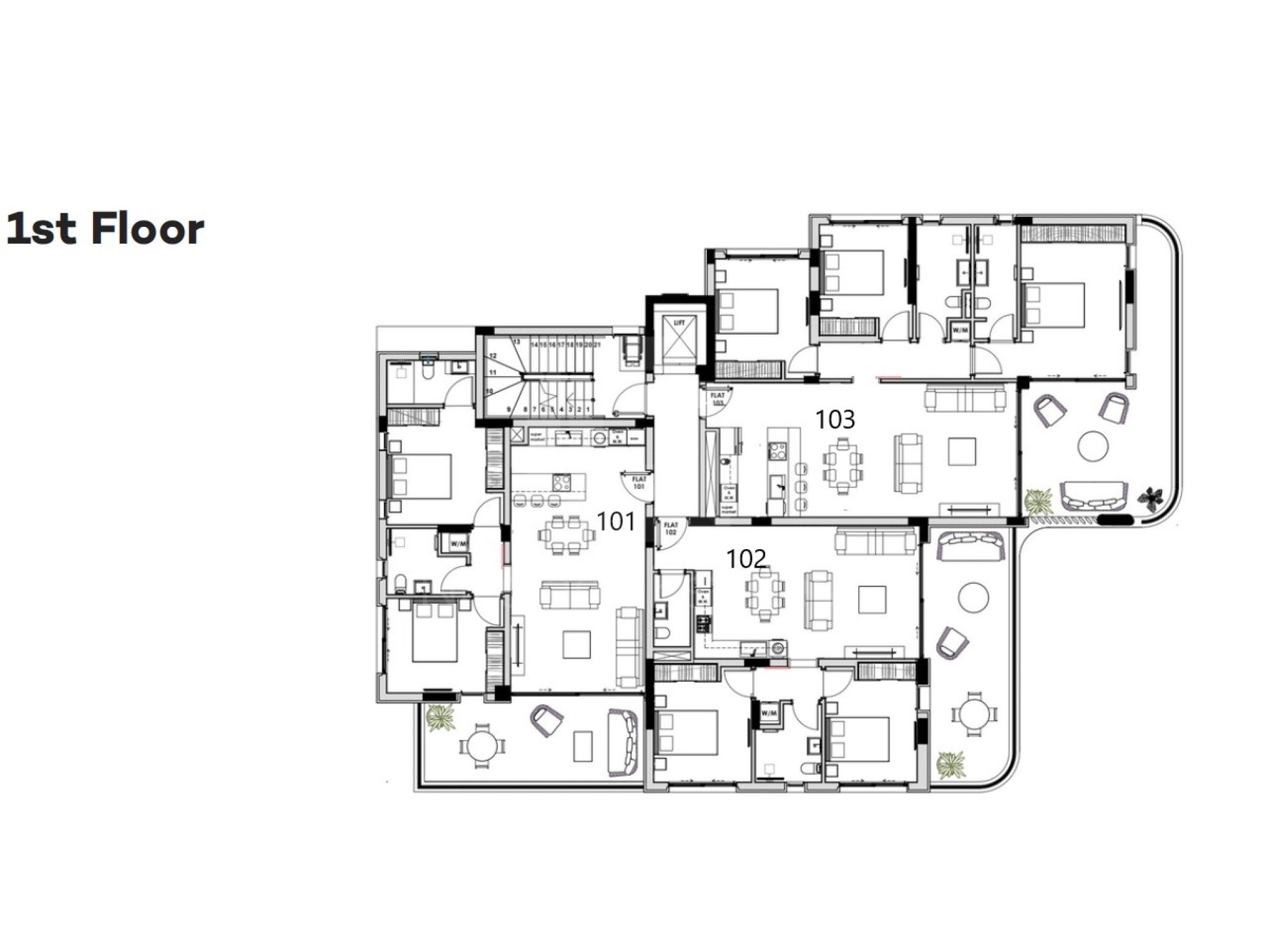 Apt. no. 103 is on the first floor and it comes with 3 bedrooms, 2 bathrooms, 128sq.m! of internal covered areas, 32sq.m covered veranda, 2 covered parking spaces and a massive 8sq.m of private storage. Price is 790000 euro plus VAT