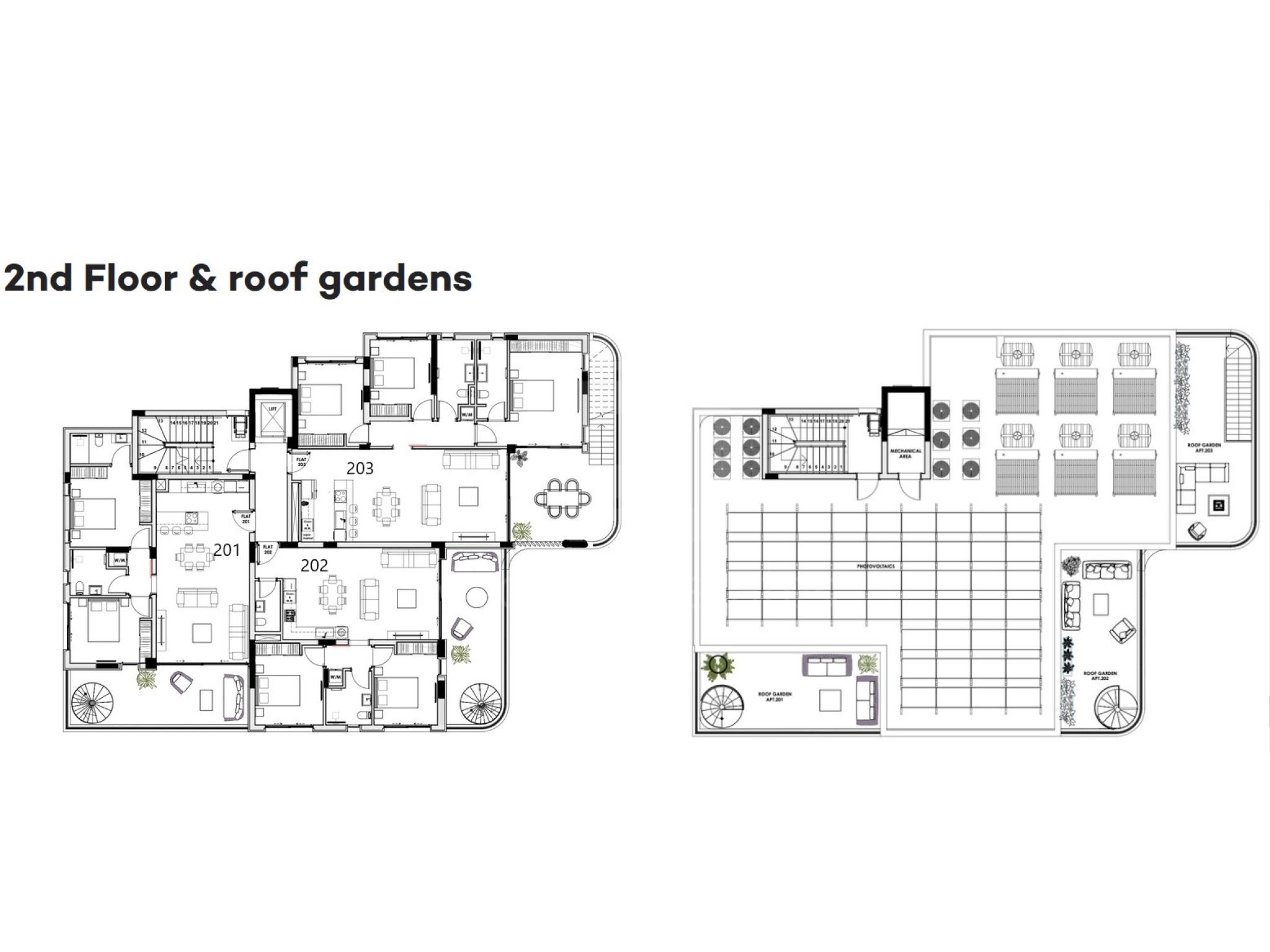 Penthouse Apt. no. 203 is on the second floor and it comes with 3 bedrooms, 2 bathrooms, 128sq.m! of internal covered areas, 28sq.m covered veranda plus 37sq.m of a private Roof Garden, 2 covered parking spaces and a massive 8sq.m of private storage. Price is 845000 euro plus VAT