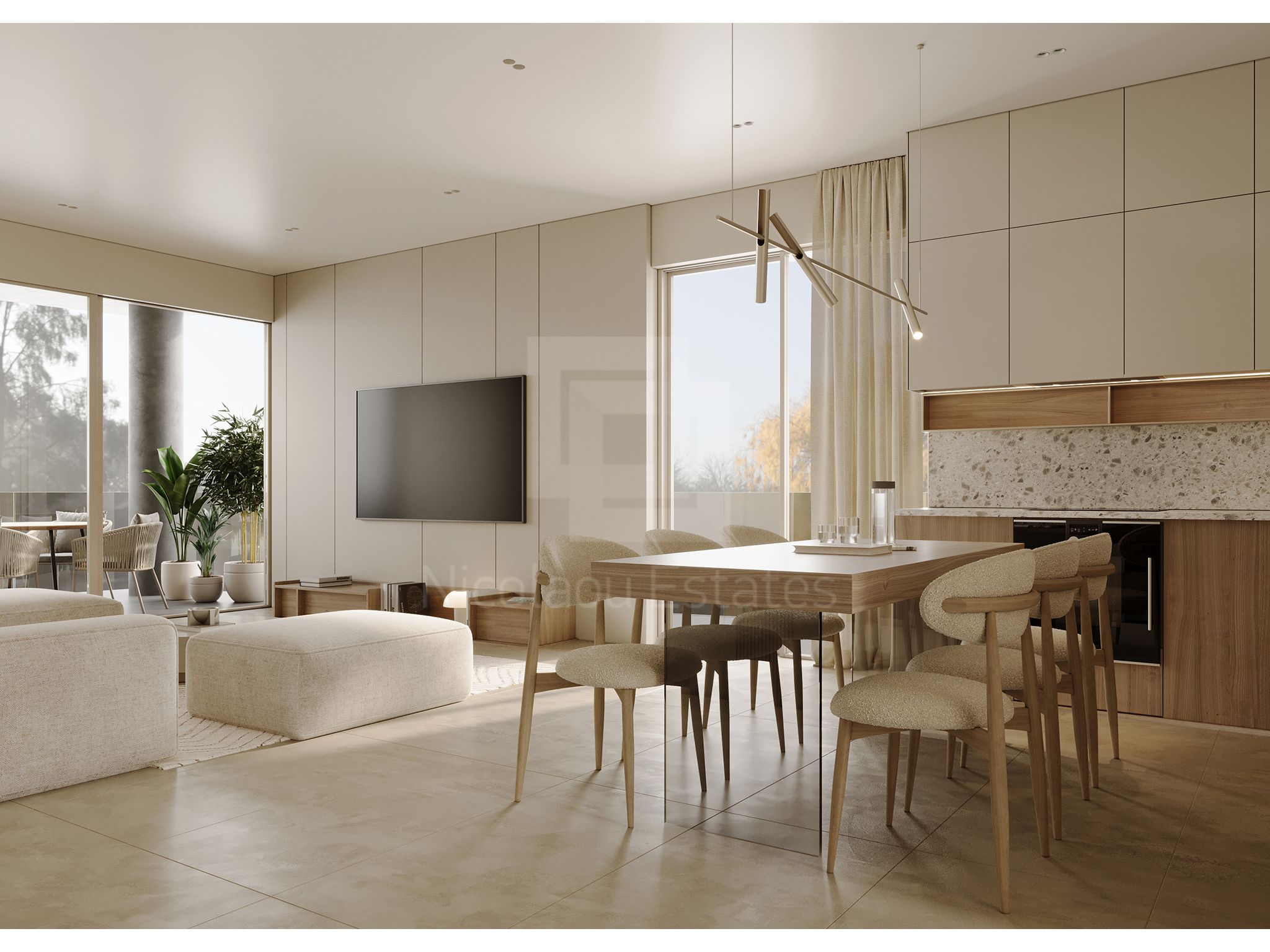Τα διαμερίσματα αποτελούνται από ενιαίο χώρο σαλόνι-τραπεζαρία και κουζίνα, 2 άνετα υπνοδωμάτια, το κυρίως με en suite, 1 μπάνιο, μεγάλη καλυμμένη βεράντα, αποθήκη και καλυμμένο χώρο στάθμευσης.