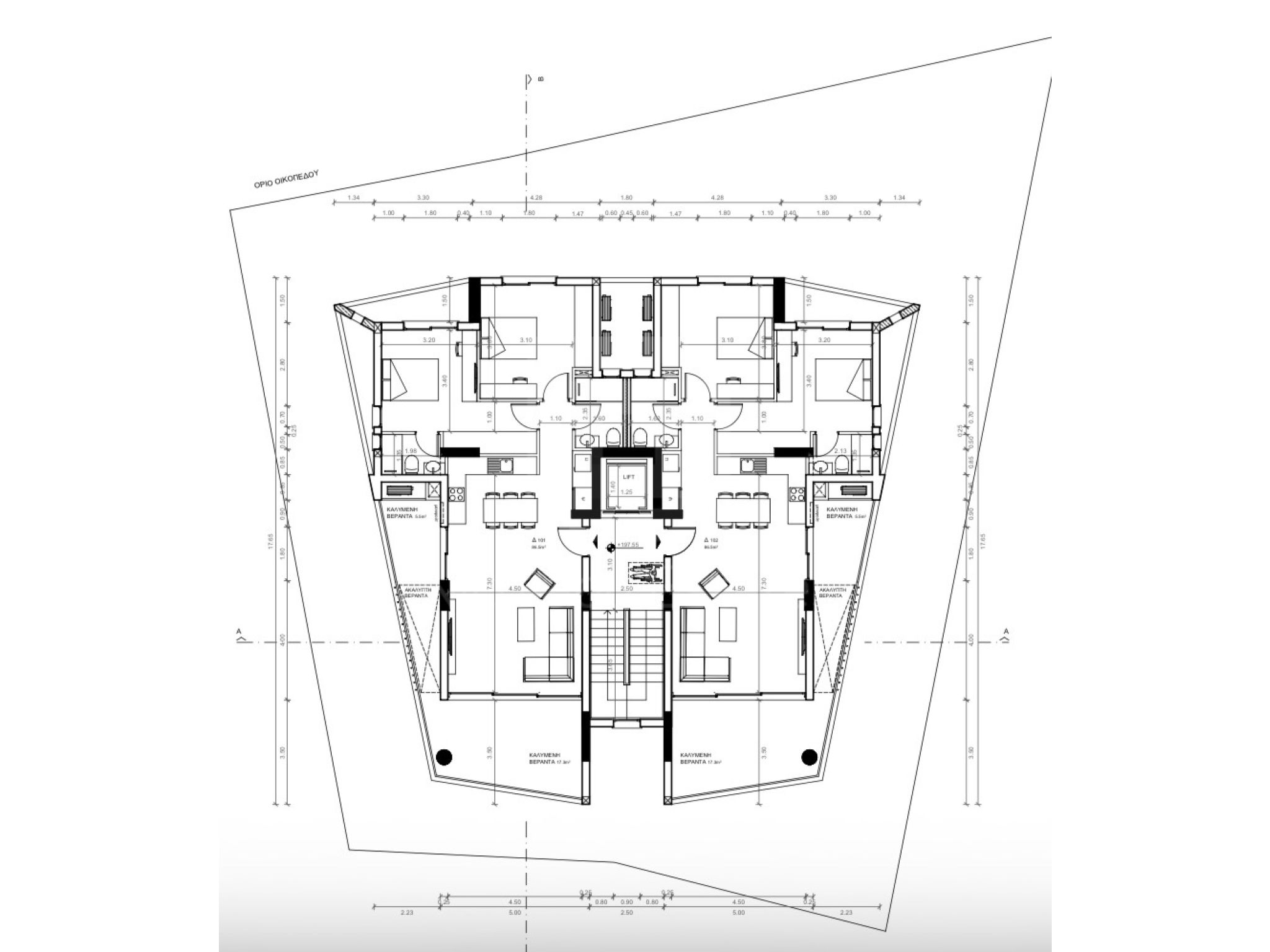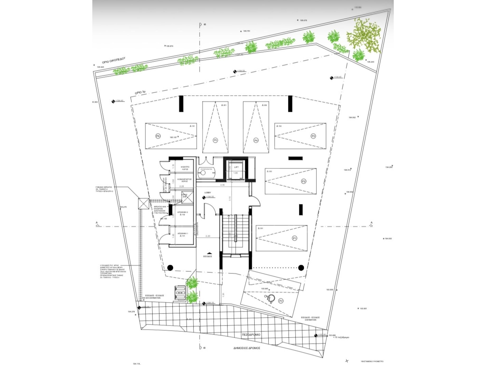 Διαμέρισμα 101 (185.000 συν ΦΠΑ): 86,5τμ καλυμμένος εσωτερικός χώρος, 22,8τμ καλυμμένη βεράντα, αποθήκη και καλυμμένος χώρος στάθμευσης.