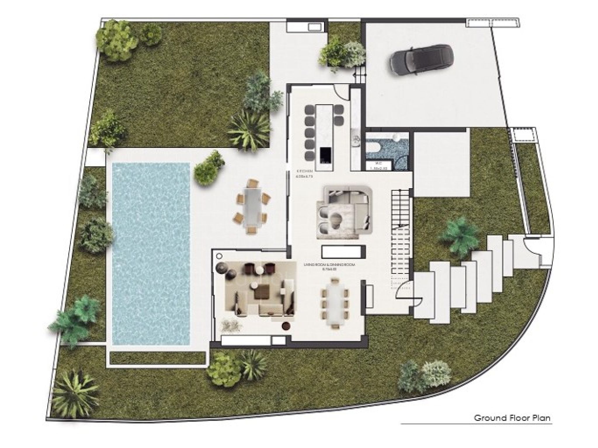 Η μεγάλη σκεπαστή βεράντα και ο χώρος διαβίωσης στο ισόγειο απέχουν λίγα βήματα από μια δροσερή βουτιά στην πισίνα και λίγο πιο κάτω ο χώρος μπάρμπεκιου με τη δική του τραπεζαρία έρχεται να ολοκληρώσει την τέλεια εξωτερική διαβίωση για όλη την οικογένεια.
