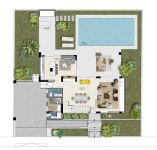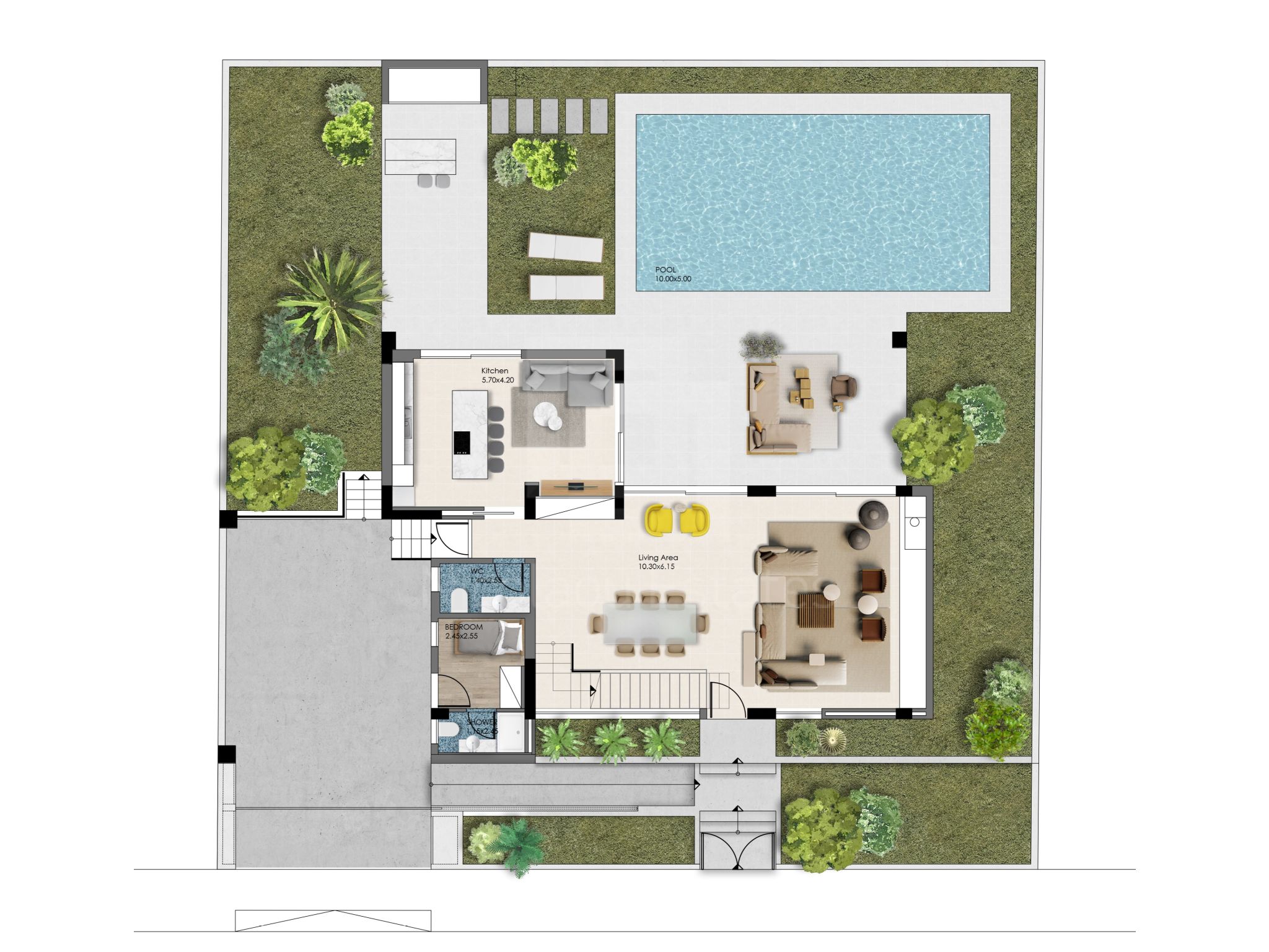 Η μεγάλη σκεπαστή βεράντα και ο χώρος διαβίωσης στο ισόγειο απέχουν λίγα βήματα από μια δροσερή βουτιά στην πισίνα και λίγο πιο κάτω ο χώρος μπάρμπεκιου με τη δική του τραπεζαρία έρχεται να ολοκληρώσει την τέλεια εξωτερική διαβίωση για όλη την οικογένεια.