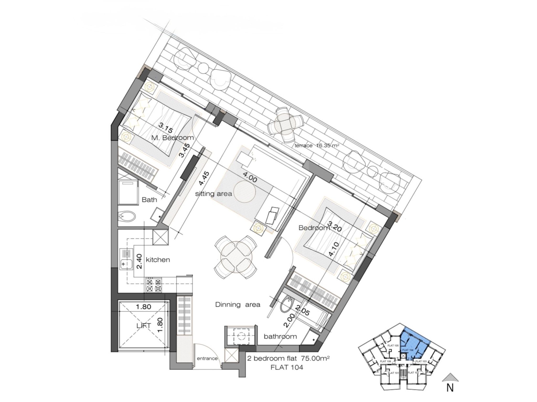 Τα διαμερίσματα είναι πανομοιότυπα και βρίσκονται στον 1ο και 2ο όροφο (104/204). Χαρακτηρίζονται από λειτουργικό σχεδιασμό, είναι ευάερα, ευήλια και διαθέτουν άνετους χώρους. Αποτελούνται από ενιαίο χώρο σαλόνι-τραπεζαρία και κουζίνα, 2 ευρύχωρα διαμερίσματα, το κυρίως με en suite, 1 μπάνιο, μεγάλη βεράντα, καλυμμένο χώρο στάθμευσης και αποθήκη.