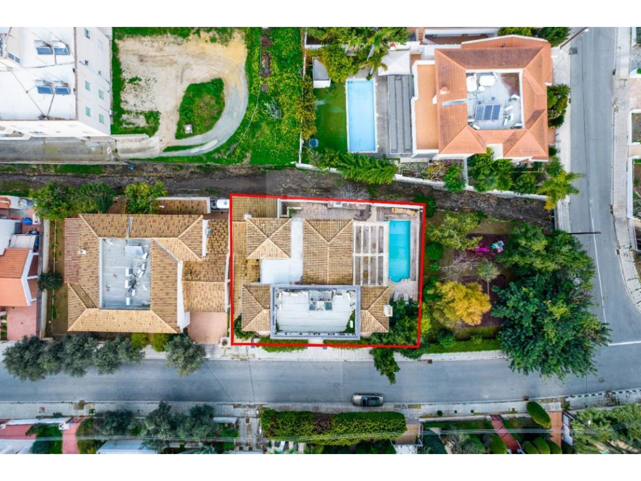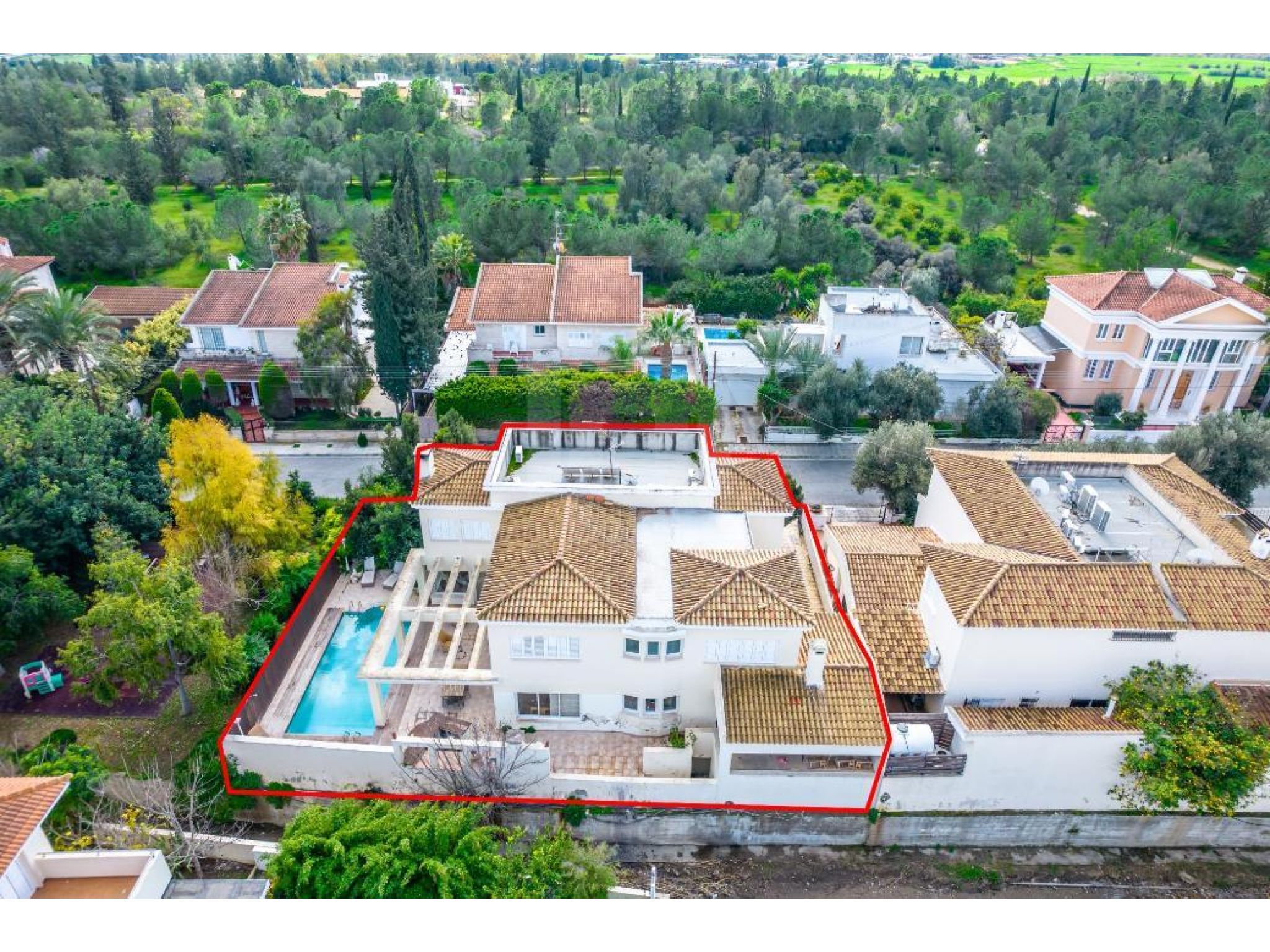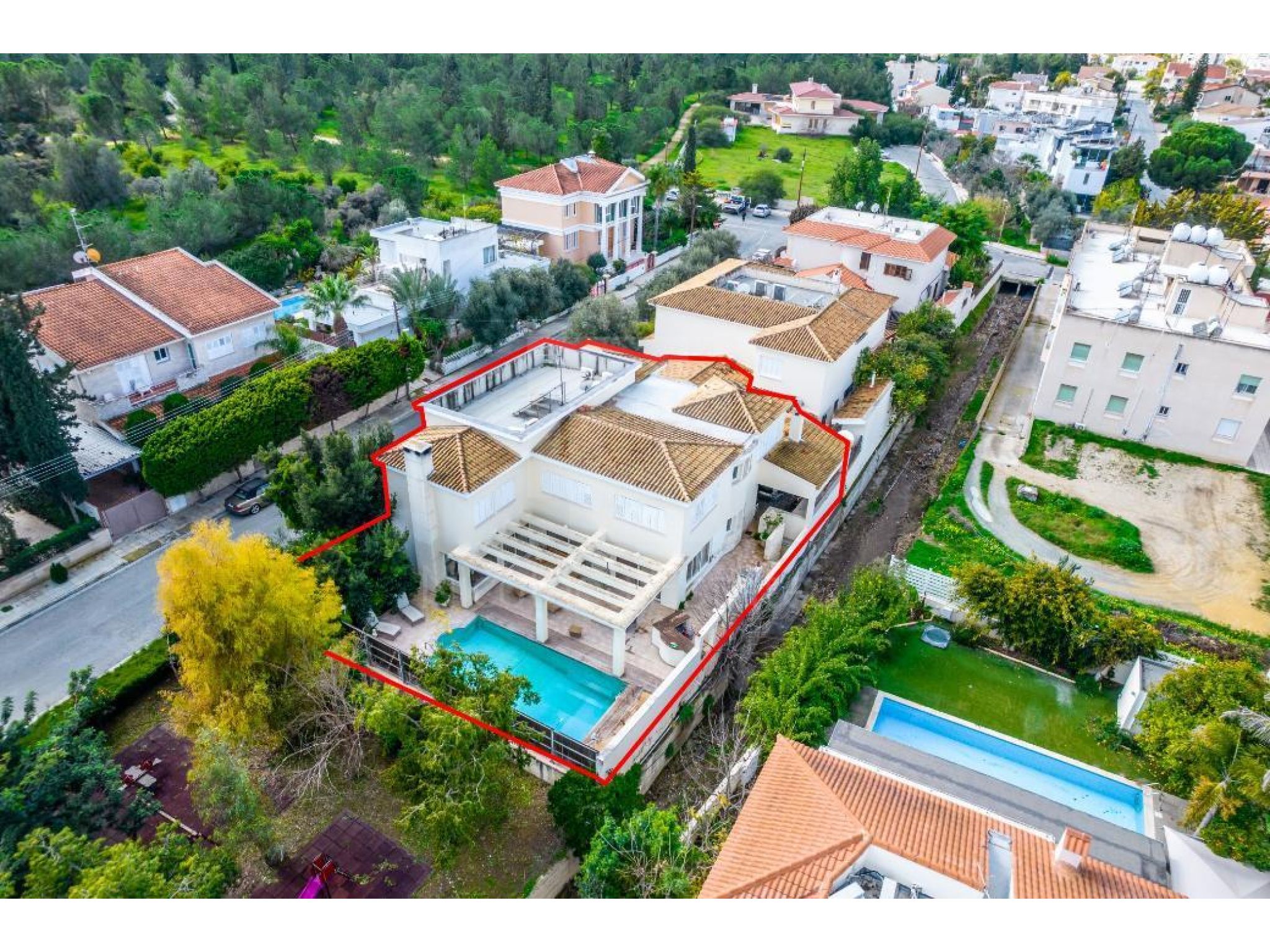 The property is a spacious 5 bedroom detached house with a swimming pool in Aglantzia. It is located few steps away from Athalassa National Forest Park and 550m from RIK avenue. The house has a covered area of 375sqm, 10sqm covered verandas, 6sqm uncovered verandas and 18sqm basement area. It also benefits from a covered parking area of 43sqm.