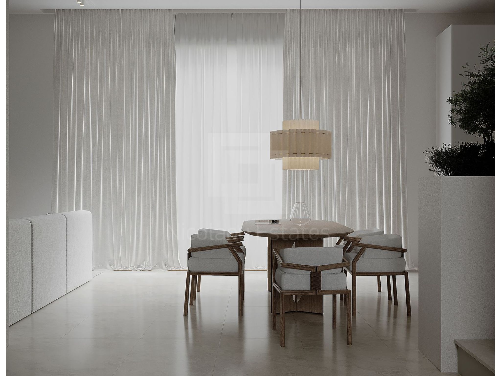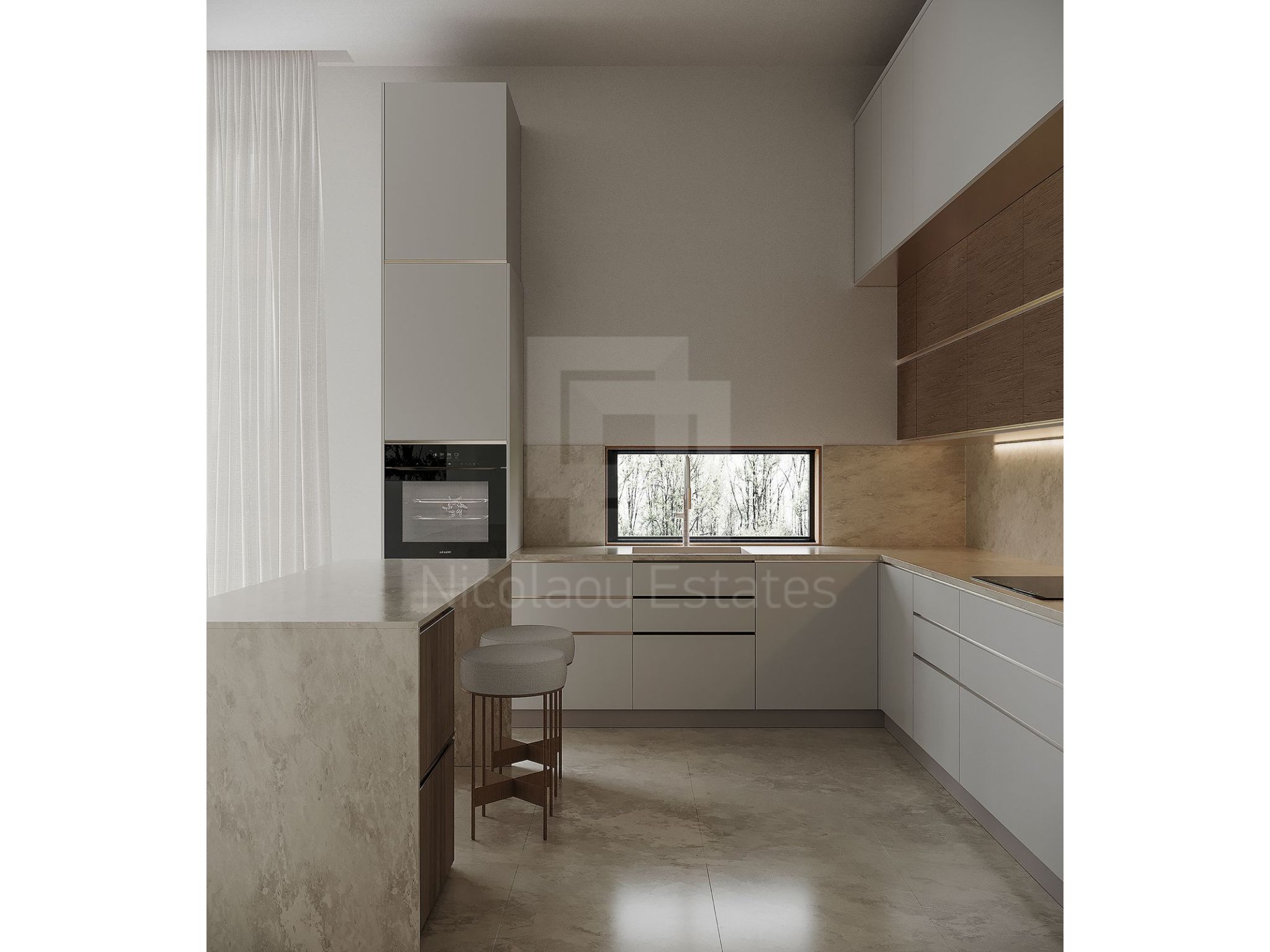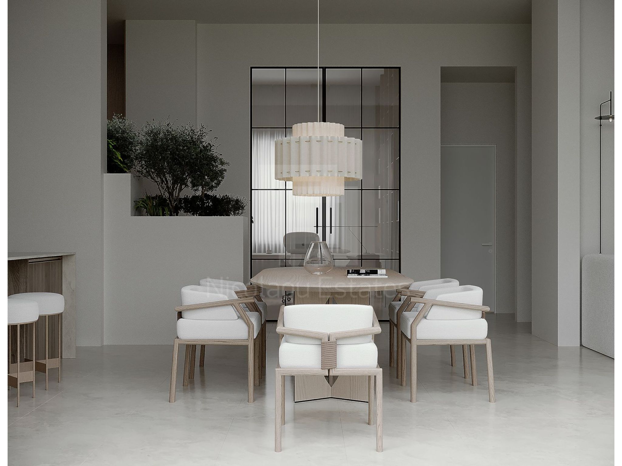 - Kitchen: Equipped with an island and space for a large table seating 8 (table not included). German kitchen Nolte is included.