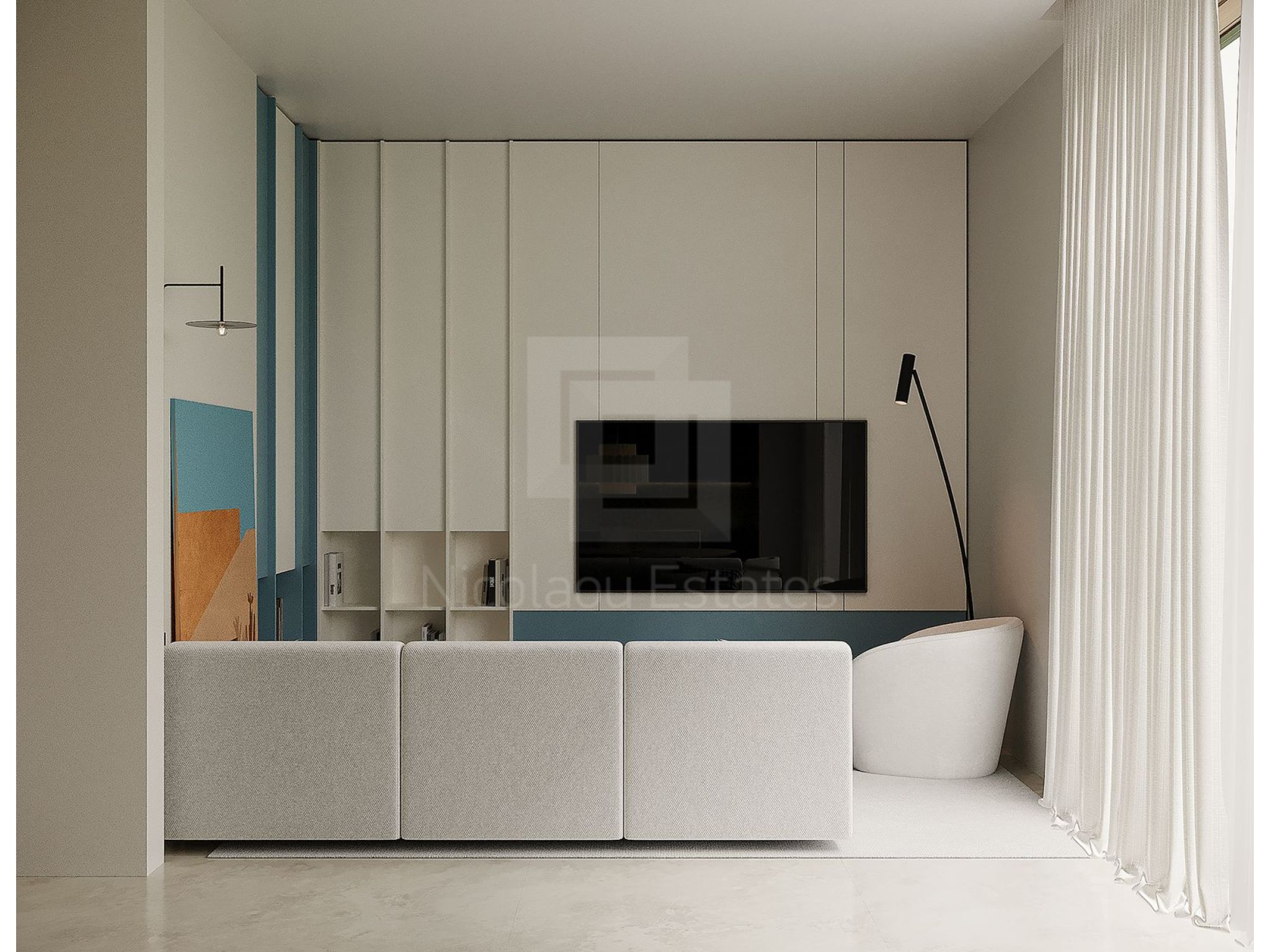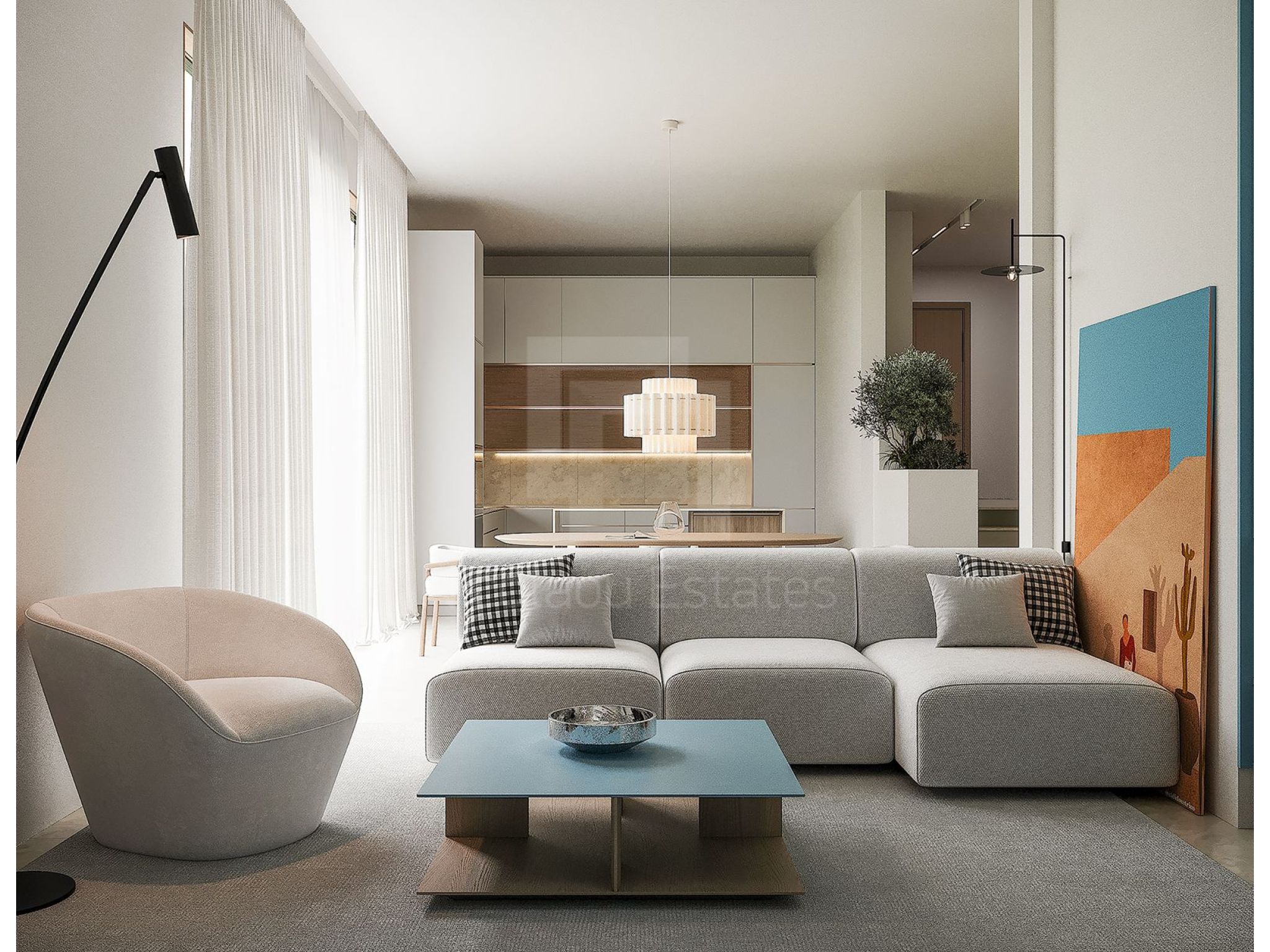 - Living Area: Ample space for two sofas and a large TV (both not included), with windows surrounding the area, including the cooking space.