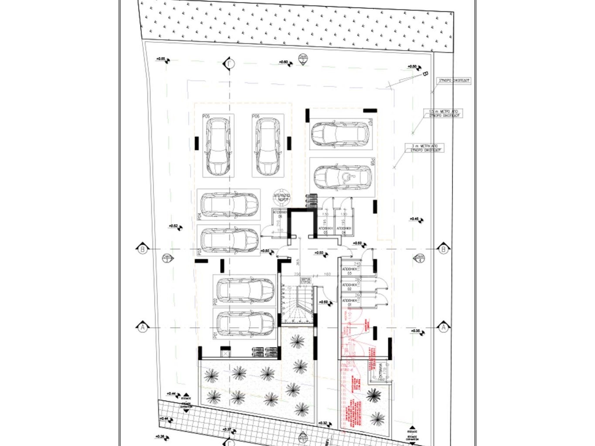 Η απόσταση του κτιρίου από τα σύνορα είναι μεγάλη για την ομαλή κυκλοφορία των αυτοκινήτων μέσα και έξω από το χώρο στάθμευσης.
